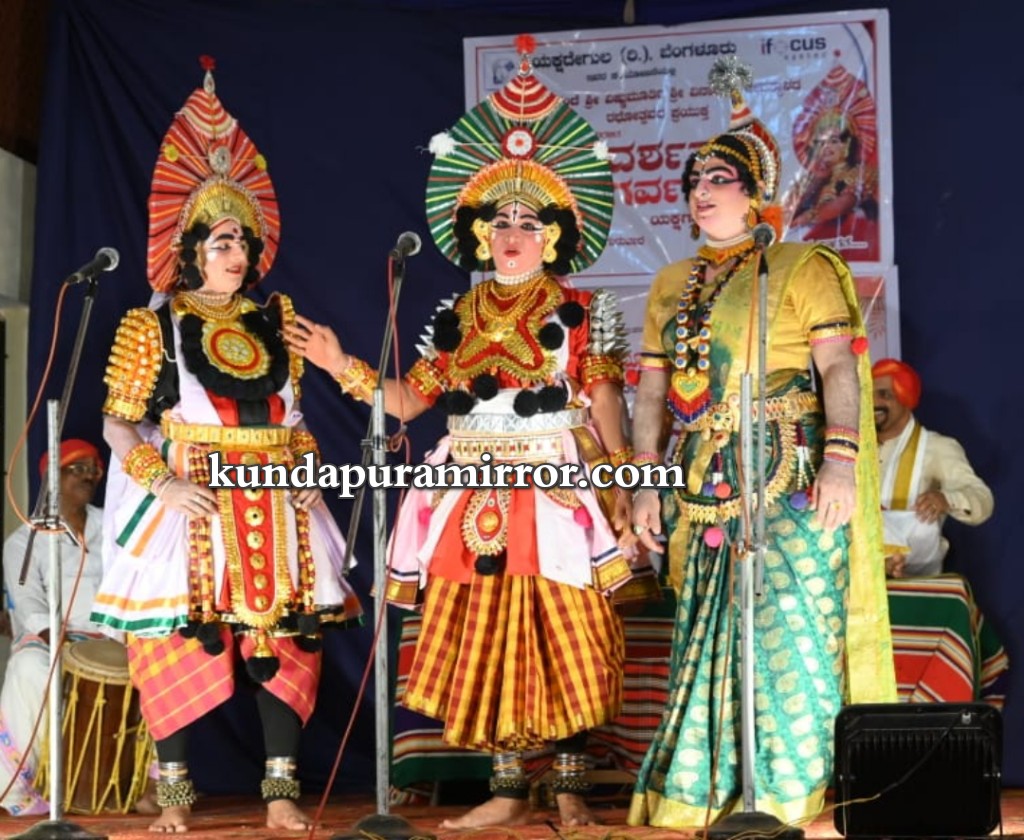 ಕೋಟ: ಕೋಟದ ಹಂದೆ ಶ್ರೀ ಮಹಾವಿಷ್ಣು ಶ್ರೀ ಮಹಾಗಣಪತಿ ದೇವಸ್ಥಾನದ ವಾರ್ಷಿಕ ರಥೋತ್ಸದ ಸಾಂಸ್ಕೃತಿಕ ಕಾರ್ಯಕ್ರಮದಲ್ಲಿ ಗುರುವಾರ ನಡೆದ ಬೆಂಗಳೂರಿನ ಯಕ್ಷದೇಗುಲ ತಂಡದ ಸಂಯೋಜನೆಯಲ್ಲಿ ಮಧುಕುಮಾರ್ ಬೋಳೂರು ವಿರಚಿತ ಸುದರ್ಶನ ಗರ್ವಭಂಗ ಯಕ್ಷಗಾನ ಪ್ರದರ್ಶನ ಎಲ್ಲರ ಗಮನ ಸೆಳೆಯಿತು. ಕೆ. ಮೋಹನ್ ನಿರ್ದೇಶನದಲ್ಲಿ ನಡೆದ ಯಕ್ಷಗಾನದಲ್ಲಿ ಹಿಮ್ಮೇಳದ ಭಾಗವತರಾಗಿ ಲಂಬೋದರ ಹೆಗಡೆ, ಮದ್ದಳೆ ವಾದನದಲ್ಲಿ ರಾಘವೇಂದ್ರ ಹೆಗಡೆ, ಚಂಡೆಯಲ್ಲಿ ಶಿವಾನಂದ ಕೋಟರವರು ಅದ್ಭುತವಾಗಿ ಕಾರ್ಯನಿರ್ವಹಿಸಿದರು.