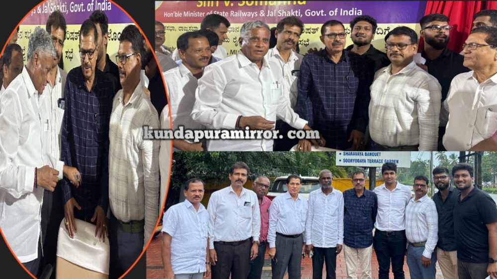 ಕುಂದಾಪುರ: ಆರ್ಥಿಕ ಸಂಕಷ್ಟ ಎದುರಿಸುತ್ತಿರುವ ಕೊಂಕಣ ರೈಲ್ವೇಯನ್ನು ಭಾರತೀಯ ರೈಲ್ವೇ ಜೊತೆ ವಿಲೀನಗೊಳಿಸುವುದನ್ನೂ ಸೇರಿಸಿ ಹಲವು ಬೇಡಿಕಗಳೊಂದಿಗೆ ಕುಂದಾಪುರ ರೈಲು ಹಿತರಕ್ಷಣಾ ಸಮಿತಿಯು ರೈಲ್ವೇ ರಾಜ್ಯ ಸಚಿವ ಸೋಮಣ್ಣನವರನ್ನು ಮಂಗಳೂರಿನಲ್ಲಿ ಭೇಟಿ ಮಾಡಿ ಮನವಿ ಸಲ್ಲಿಸಿತು.