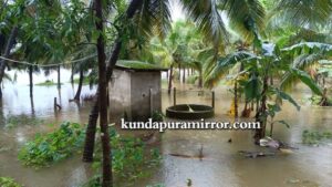 ಬೈಂದೂರು :ಕಳೆದ ಐದು ದಿನಗಳಿಂದ ಸುರಿಯುತ್ತಿರುವ ಭಾರೀ ಮಳೆಗೆ ಮತ್ತು ನೆರೆಗೆ ತಾಲೂಕಿನ ಹಲವಾರು ಗ್ರಾಮಗಳ ತಗ್ಗುಪ್ರದೇಶಗಳು ನೀರಿನಲ್ಲಿ ಮುಳುಗಿದ್ದು, ಕೆಲವು ಗ್ರಾಮಗಳಲ್ಲಿ ಹಲವಾರು ಎಕರೆ ಕೃಷಿ ಭೂಮಿ ಸಂಪೂರ್ಣ ಹಾಳಾಗಿದೆ.