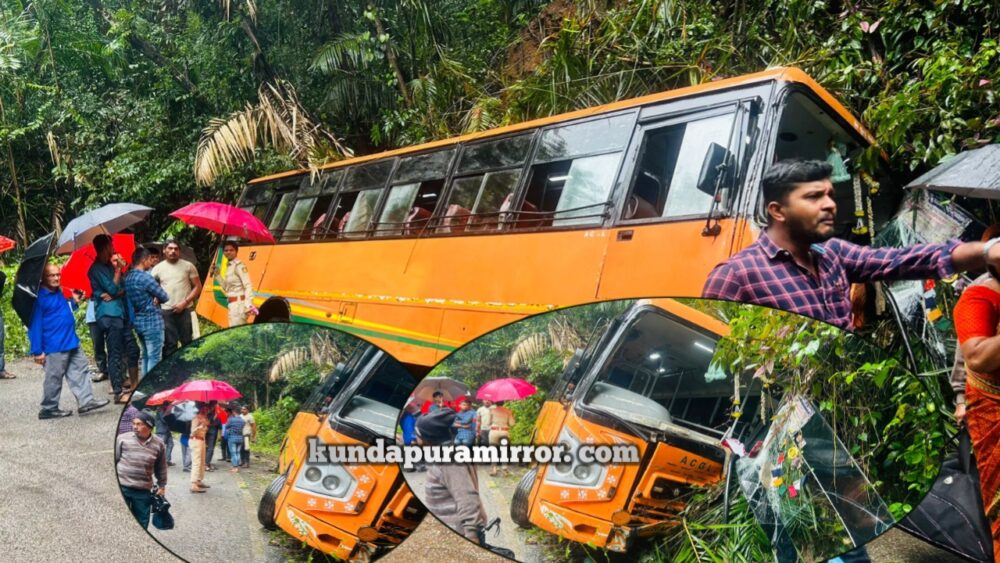 ಕುಂದಾಪುರ: ಶಿವಮೊಗ್ಗ ಕಡೆಯಿಂದ ಬೈಂದೂರು ಕಡೆಗೆ ಪ್ರಯಾಣಿಸುತ್ತಿದ್ದ ಖಾಸಗೀ ಬಸ್ಸೊಂದು ಚಾಲಕನ ನಿಯಂತ್ರಣ ತಪ್ಪಿ ಚರಂಡಿಗಿಳಿದ ಘಟನೆ ಕೊಲ್ಲೂರು ಸಮೀಪದ ದಳಿ ಮುರ್ಕ್ಲು ಬಳಿ ಸೋಮವಾರ ಬೆಳಿಗ್ಗೆ ನಡೆದಿದೆ. ಶ್ರೀ ದುರ್ಗಾಂಬಾ ಎಂಬ ಖಾಸಗೀ ಬಸ್ಸು ಸೋಮವಾರ ಬೆಳಿಗ್ಗೆ ಶಿವಮೊಗ್ಗದಿಂದ ಬೈಂದೂರಿಗೆ ಬರುತ್ತಿತ್ತು. ಬೆಳಿಗ್ಗೆ 8.45ರ ಸುಮಾರಿಗೆ ಕೊಲ್ಲೂರು ಸಮೀಪದ ದಳಿ ಮುರ್ಕ್ಲು ಬಳಿ ನಿಯಂತ್ರಣ ತಪ್ಪಿ ರಸ್ತೆಯಿಂದ ಕೆಳಗೆ ಚರಂಡಿಗೆ ಇಳಿದು ಓರೆಯಾಗಿ ಮರಕ್ಕೆ ತಾಗಿ ನಿಂತಿದೆ.