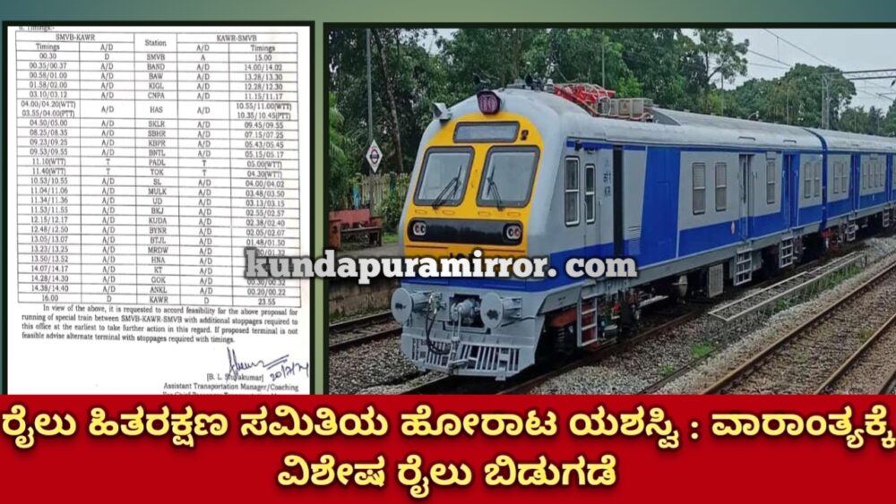 ಪ್ರಯಾಣಿಕರ ಸಮಸ್ಯೆ ಬಗ್ಗೆ ಕುಂದಾಪುರ ರೈಲು ಹಿತರಕ್ಷಣ ಸಮಿತಿಯ ಅಧ್ಯಕ್ಷ ಗಣೇಶ್ ಪುತ್ರನ್ ಅವರು ಸಂಸದ ಕೋಟ ಶ್ರೀನಿವಾಸ ಪೂಜಾರಿ ಬಳಿ ಪಡೀಲ್ ಬೈಪಾಸ್ ಮೂಲಕ ವಾರಾಂತ್ಯದ ಬೆಂಗಳೂರು ಕುಂದಾಪುರ ವಿಶೇಷ ರೈಲಿಗೆ ಮನವಿ ಮಾಡಿದ್ದು, ಸಂಸದ ಕೋಟ ರೈಲ್ವೆ ಖಾತೆ ರಾಜ್ಯ ಸಚಿವ ವಿ. ಸೋಮಣ್ಣ ಅವರನ್ನು ಸಂಪರ್ಕಿಸಿ ವಾರಾಂತ್ಯದ ವಿಶೇಷ ರೈಲು ತರುವಲ್ಲಿ ಯಶಸ್ವಿಯಾಗಿದ್ದಾರೆ. ರೈಲು ಹಿತರಕ್ಷಣ ಸಮಿತಿಯ ಹೋರಾಟಕ್ಕೆ ಈಗ ವ್ಯಾಪಕ ಶ್ಲಾಘನೆ ವ್ಯಕ್ತವಾಗಿದೆ.