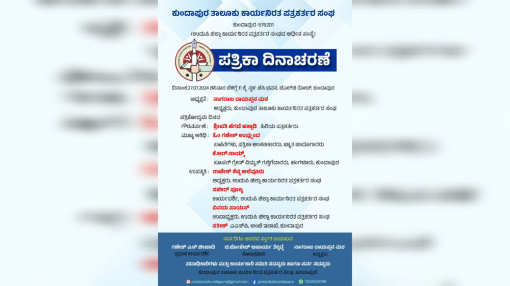 ಕುಂದಾಪುರ : ಉಡುಪಿ ಜಿಲ್ಲಾ ಕಾರ್ಯನಿರತ ಪತ್ರಕರ್ತರ ಸಂಘದ ಅಧೀನ ಸಂಸ್ಥೆಯಾದ ಕುಂದಾಪುರ ತಾಲೂಕು ಕಾರ್ಯನಿರತ ಪತ್ರಕರ್ತರ ಸಂಘದ ವತಿಯಿಂದ ಪತ್ರಿಕಾ ದಿನಾಚರಣೆಯು ಜು. 27 ರಂದು ಬೆಳಗ್ಗೆ 11 ಗಂಟೆಗೆ ಕುಂದಾಪುರದ ಜೆಎಲ್ಬಿ ರಸ್ತೆಯ ಜೆಸಿ ಭವನದಲ್ಲಿ ನಡೆಯಲಿದೆ.