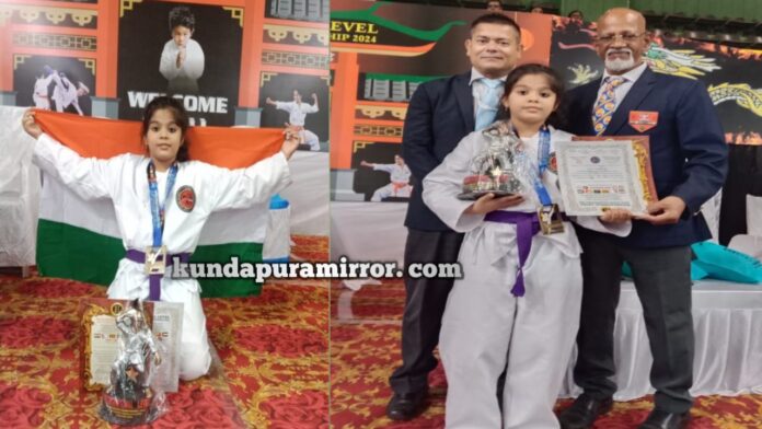 ಕುಂದಾಪುರ : ಶಿವಮೊಗ್ಗದಲ್ಲಿ ಆ.4ರಂದು ಆಯೋಜಿಸಲಾದ ಇಂಟರ್ ನ್ಯಾಶನಲ್ ಓಪನ್ ಕರಾಟೆ ಚಾಂಪಿಯನ್ ಸ್ಪರ್ಧೆಯ ಕಟಾ ಮತ್ತು ಕುಮಿಟೆಯಲ್ಲಿ 8ವರ್ಷ ವಯೋಮಿತಿಯಲ್ಲಿ ಪ್ರಥಮ ಸ್ಥಾನ ಪಡೆದು ಚಿನ್ನದ ಪದಕಗಳಿಸಿರುವ ಅಮೈರಾ ಶೋಲಾಪುರ. ಕುಂದಾಪುರದ ಓಕ್ ವುಡ್ ಇಂಡಿಯನ್ ಸ್ಕೂಲ್ ನ 4ನೇ ತರಗತಿ ವಿದ್ಯಾರ್ಥಿನಿಯಾಗಿರುವ ಈಕೆ ಯಾಸೀನ್ ಶೋಲಾಪುರ ಹಾಗೂ ರಝಿಯಾ ಸುಲ್ತಾನ ದಂಪತಿಗಳ ಪುತ್ರಿಯಾಗಿದ್ದಾಳೆ. ಕುಂದಾಪುರ ಕೆಡಿಎಫ್ ಅಕಾಡೆಮಿಯ ಕಿಯೊಷಿ ಕಿರಣ್, ಶಿಹಾನ್ ಸಂದೀಪ್,ಸಿಹಾನ್ ಶೇಕ್ ಮತ್ತು ಶಶಾಂಕ್ ಇವರಿಂದ ತರಬೇತಿ ಪಡೆದಿರುತ್ತಾಳೆ.