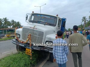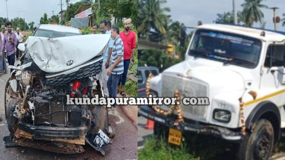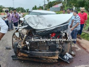 ಬೀಜಾಡಿ ಸರ್ವಿಸ್ ರಸ್ತೆಯಿಂದ ಹೆದ್ದಾರಿಗೆ ಹೋಗುತ್ತಿದ್ದ ಕಾರು ಕುಂಭಾಸಿಯಿಂದ ಕುಂದಾಪುರದ ಕಡೆಗೆ ಅತಿವೇಗವಾಗಿ ಬಂದ ಟಿಪ್ಪರ್ ಕಾರಿಗೆ ಗುದ್ದಿದ ಪರಿಣಾಮ ಕಾರು ಸಂಪೂರ್ಣ ಹಾನಿಯಾಗಿದೆ. ಟಿಪ್ಪರ್ ನಿಯಂತ್ರಣ ತಪ್ಪಿ ಹೆದ್ದಾರಿ ಡಿವೈಡರ್ ಮಧ್ಯದಲ್ಲಿ ನಿಂತಿದೆ. ಕಾರಿನಲ್ಲಿದ್ದವರು ಪ್ರಾಣಾಪಾಯದಿಂದ ಪಾರಾಗಿದ್ದಾರೆ.