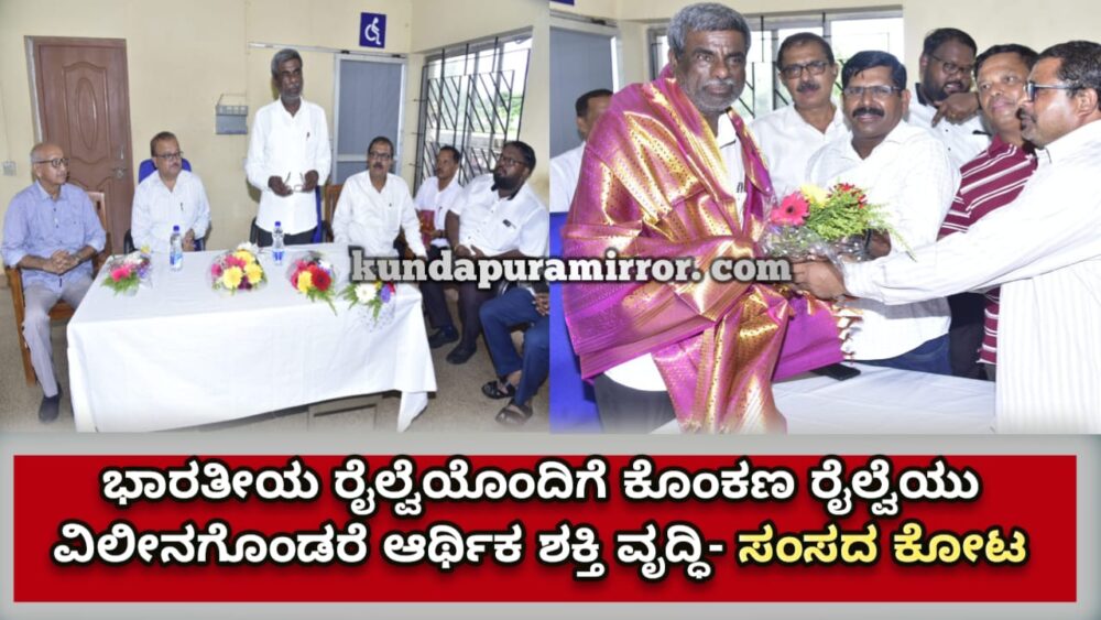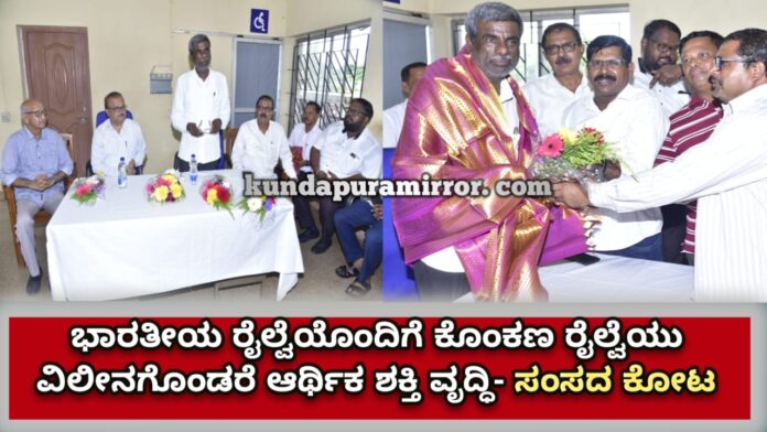 ಕುಂದಾಪುರ : ಭಾರತೀಯ ರೈಲ್ವೆಯೊಂದಿಗೆ ಕೊಂಕಣ ರೈಲ್ವೆಯು ವಿಲೀನಗೊಂಡರೆ ಈ ಭಾಗದ ಆರ್ಥಿಕ ಶಕ್ತಿಯು ವೃದ್ಧಿಸಲಿದೆ. ಇದರಿಂದ ಹೊಸ ರೈಲುಗಳ ಆರಂಭ ನಿಲುಗಡೆಗೂ ಅನುಕೂಲವಾಗಲಿದೆ. ನಿಲ್ದಾಣಗಳು ಅಭಿವೃದ್ಧಿಯಾಗಲಿದೆ. ಈ ನಿಟ್ಟಿನಲ್ಲಿ ಕೊಂಕಣ ರೈಲ್ವೆ ವ್ಯಾಪ್ತಿಯ ಕರ್ನಾಟಕ, ಮಹಾರಾಷ್ಟ್ರ, ಕೇರಳ ಹಾಗೂ ಗೋವಾ ರಾಜ್ಯಗಳ ಸರಕಾರದೊಂದಿಗೆ ಮಾತುಕತೆ ನಡೆಯುತ್ತಿದೆ. ಆದಷ್ಟು ಬೇಗ ಈ ಬಗ್ಗೆ ಅಂತಿಮ ತೀರ್ಮಾನ ಕೈಗೊಳ್ಳಲಾಗುವುದು ಎಂದು ಉಡುಪಿ – ಚಿಕ್ಕಮಗಳೂರು ಸಂಸದ ಕೋಟ ಶ್ರೀನಿವಾಸ ಪೂಜಾರಿ ಹೇಳಿದರು.