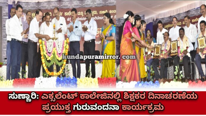 ಕುಂದಾಪುರ : ಇಲ್ಲಿಗೆ ಸಮೀಪದ ಸುಣ್ಣಾರಿ ಎಕ್ಸಲೆಂಟ್ ಪದವಿ ಪೂರ್ವ ಕಾಲೇಜು ಮತ್ತು ಹೈಸ್ಕೂಲು ವತಿಯಿಂದ ಮಂಗಳವಾರ ಶಿಕ್ಷಕರ ದಿನಾಚರಣೆಯ ಪ್ರಯುಕ್ತ ಗುರುವಂದನಾ ಕಾರ್ಯಕ್ರಮ ಎಕ್ಸಲೆಂಟ್ ಕ್ಯಾಂಪಸ್ ನಲ್ಲಿ ನಡೆಯಿತು. ಕಾರ್ಯಕ್ರಮದಲ್ಲಿ ಜಿಲ್ಲಾ ಅತ್ಯುತ್ತಮ ಶಿಕ್ಷಕ ಪ್ರಶಸ್ತಿ ವಿಜೇತರನ್ನು ಸನ್ಮಾನಿಸಿದ ಕಟೀಲಿನ ವಿಶ್ರಾಂತ ಪ್ರಾಂಶುಪಾಲರಾದ ಪ್ರೋ. ಎಂ ಬಾಲಕೃಷ್ಣ ಶೆಟ್ಟಿ ಮಾತನಾಡಿ, ತಾಯಿಯೇ ಮೊದಲ ಶಿಕ್ಷಕಿ. ನಾವು ಮೊದಲು ತಾಯಿಯನ್ನು ಗೌರವಿಸುವುದನ್ನು ಅಭ್ಯಾಸ ಮಾಡಿಕೊಳ್ಳಬೇಕು. ಶಿಕ್ಷಕರಿಗೆ ಸಮಾಜದಲ್ಲಿ ಗೌರವಯುತ ಸ್ಥಾನವಿದೆ. ಈ ದೇಶ ಸದೃಢವಾಗಬೇಕಾದರೆ ವಿದ್ಯಾರ್ಥಿಗಳನ್ನು ತಿದ್ದುವ ಶಿಕ್ಷಕರು ಪ್ರಾಮಾಣಿಕವಾಗಿರಬೇಕು. ಶತಮಾನಗಳ ಮುಂದಾಲೋಚನೆಯೊಂದಿಗೆ ಎಕ್ಸಲೆಂಟ್ ಕಾಲೇಜು ಮುನ್ನಡೆಯುತ್ತಿರುವುದು ಶ್ಲಾಘನೀಯ ಎಂದರು.