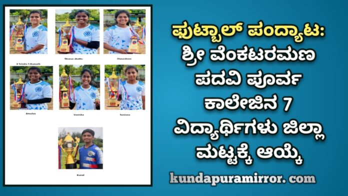 ಕುಂದಾಪುರ :ಶಾಲಾ ಶಿಕ್ಷಣ ಇಲಾಖೆ ( ಪದವಿ ಪೂರ್ವ ವಿಭಾಗ ) ಮತ್ತು ಗುರುಕುಲ ಪದವಿ ಪೂರ್ವ ಕಾಲೇಜು ವಕ್ವಾಡಿ ಕೋಟೇಶ್ವರ ಇವರ ಸಂಯುಕ್ತ ಆಶ್ರಯದಲ್ಲಿ ನಡೆದ ಕುಂದಾಪುರ ತಾಲೂಕು ಮಟ್ಟದ ಪದವಿ ಪೂರ್ವ ವಿಭಾಗದ ಬಾಲಕ – ಬಾಲಕಿಯರ ಫುಟ್ಬಾಲ್ ಪಂದ್ಯಾಟದಲ್ಲಿ ಶ್ರೀ ವೆಂಕಟರಮಣ ಪದವಿ ಪೂರ್ವ ಕಾಲೇಜು ದ್ವಿತೀಯ ಸ್ಥಾನ ಪಡೆಯುವುದರೊಂದಿಗೆ ಕಾಲೇಜಿನ ವಿದ್ಯಾರ್ಥಿಗಳಾದ ಕುನಾಲ್, ಕೆ.ಶ್ರೀನಿತಾ ಎಸ್ ಕಾಮತ್, ಶ್ರೇಯಾ ಶೆಟ್ಟಿ, ದಿವ್ಯಶ್ರೀ, ಅಮೂಲ್ಯ, ಸಂಜನಾ, ವನಿಷಾ ಜಿಲ್ಲಾ ಮಟ್ಟಕ್ಕೆ ಆಯ್ಕೆಯಾಗಿದ್ದಾರೆ.