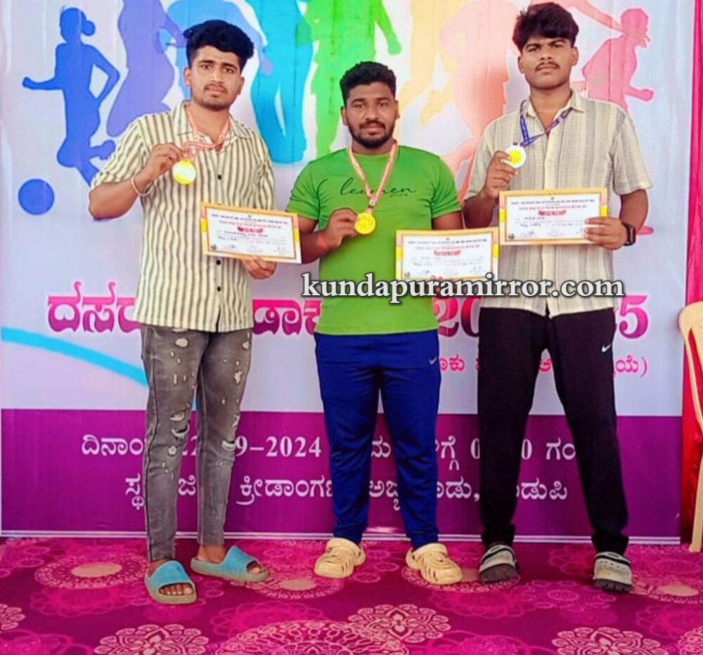 ಕುಂದಾಪುರ :ಉಡುಪಿ ಜಿಲ್ಲಾ ಯುವಜನ ಮತ್ತು ಕ್ರೀಡಾ ಇಲಾಖೆಯ ಆಶ್ರಯದಲ್ಲಿ ನಡೆದ ಜಿಲ್ಲಾ ಮಟ್ಟದ ದಸರಾ ಕುಸ್ತಿ ಕ್ರೀಡಾಕೂಟದಲ್ಲಿ ಶ್ರೀ ಶಾರದಾ ಕಾಲೇಜಿನ ವಿದ್ಯಾರ್ಥಿಗಳಾದ ಅವಿನಾಶ್ ತೃತೀಯ ಬಿ ಕಾಂ ಮಂಜುನಾಥ ತೃತೀಯ ಬಿ ಎ ಚಿನ್ನದ ಪದಕ, ಸಂತೋಷ ತೃತೀಯ ಬಿ ಎ ಕಂಚಿನ ಪದಕ ಪಡೆದು ಕಾಲೇಜಿಗೆ ಕೀರ್ತಿ ತಂದಿದ್ದಾರೆ.