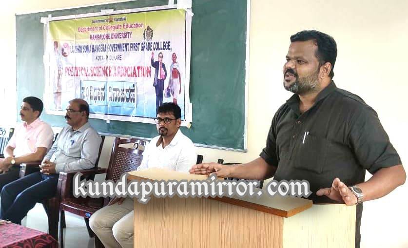 ಕೋಟ: ಲಕ್ಷ್ಮೀ ಸೋಮ ಬಂಗೇರ ಕಾಲೇಜಿನಲ್ಲಿ ರಾಜಕೀಯಶಾಸ್ತ್ರ ವಿಭಾಗದಿಂದ ಆಯೋಜಿಸಲ್ಪಟ್ಟ ಸಂವಿಧಾನ ದಿನಾಚರಣೆಯ ಸಂದರ್ಭದಲ್ಲಿ ಸಂಪನ್ಮೂಲ ವ್ಯಕ್ತಿಯಾಗಿ ಭಾಗವಹಿಸಿದ ಉಡುಪಿ ಸರಕಾರಿ ಪದವಿ ಪೂರ್ವ ಕಾಲೇಜಿನ ಉಪನ್ಯಾಸಕ ಡಾ. ಸುಧಾಕರ್ ದೇವಾಡಿಗ ಮಾತನಾಡಿ ಭಾರತದಲ್ಲಿ ಸಂವಿಧಾನದಿಂದ ಪ್ರಜಾಪ್ರಭುತ್ವ ಸಾಕಾರಗೊಂಡಿದೆ. ಪ್ರಜಾತಂತ್ರ ಮೌಲ್ಯಗಳಾದ ಸಮಾನತೆ, ಸ್ವಾತಂತ್ರ್ಯ ಮತ್ತು ಹಕ್ಕುಗಳೇನಾದರೂ ಸಾಮಾನ್ಯರಿಗೆ ದೊರಕಿದ್ದರೆ ಮತ್ತು ರಕ್ಷಿಸ್ಪಟ್ಟಿದ್ದರೆ ಅದು ಸಂವಿಧಾನದಿಂದ. ಬಹುರೂಪಿ ದೇಶವಾಗಿದ್ದರೂ ಐಕ್ಯತೆ ಮತ್ತು ಸಮಗ್ರತೆ ಕೂಡ ಸಂವಿಧಾನದಿಂದಾಗಿ ಸಾಧ್ಯವಾಗಿದೆ. ಸಂವಿಧಾನ ಕೇವಲ ಆಡಳಿತ ವೈಖರಿಯನ್ನು ನಿರ್ದೇಶಿಸುವ ಗ್ರಂಥವಾಗಿದೆ. ದೇಶವನ್ನು ನಿರ್ಮಾಣ ಮಾಡುವ, ರಕ್ಷಿಸುವ ಹಾಗೂ ಎಲ್ಲಾ ಕಳಂಕಗಳನ್ನು ಹೋಗಲಾಡಿಸುವ ಕನಸಿನ ಮಾದರಿ ಎಂದರು.
