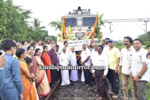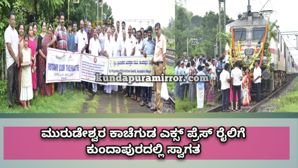 ಕುಂದಾಪುರ : ಮಂಗಳೂರುವರೆಗೆ ಮಾತ್ರವಿದ್ದ ತಿರುಪತಿ ರೈಲನ್ನು ಮುರ್ಡೇಶ್ವರದವರೆಗೆ ವಿಸ್ತರಿಸಲಾಗಿದ್ದು, ಮೊದಲ ಓಡಾಟವು ವಿಜಯ ದಶಮಿ ದಿನವಾರ ಶನಿವಾರ ಆರಂಭಗೊಂಡಿತು. ಕರಾವಳಿಯ ಮೂರು ಜಿಲ್ಲೆಗಳ ಅಸಂಖ್ಯ ಭಕ್ತರ ಬೇಡಿಕೆಯಾಗಿದ್ದ ಈ ತಿರುಪತಿ ರೈಲು ಮೊದಲ ಬಾರಿಗೆ ಕುಂದಾಪುರಕ್ಕೆ ಬರುತ್ತಿದ್ದಂತೆ ಅದ್ಧೂರಿಯಾಗಿ ಸ್ವಾಗತ ಕೋರಲಾಯಿತು.