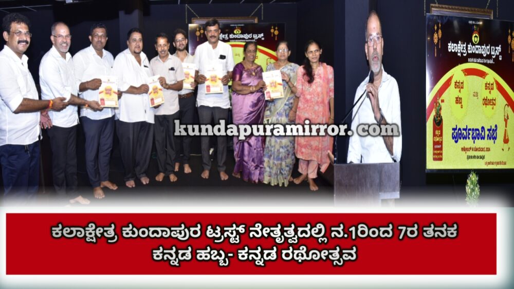 ಕುಂದಾಪುರ :ಕಲಾಕ್ಷೇತ್ರ ಕುಂದಾಪುರ ಟ್ರಸ್ಟ್ ನೇತೃತ್ವದಲ್ಲಿ ಕುಂದಾಪುರದ ಬೋರ್ಡ್ ಹೈಸ್ಕೂಲ್ ಆವರಣದಲ್ಲಿ ನವಂಬರ್ 1ರಿಂದ 7ರ ತನಕ ಕನ್ನಡ ಹಬ್ಬ-ಕನ್ನಡ ರಥೋತ್ಸವ ಎನ್ನುವ ಕಾರ್ಯಕ್ರಮ ನಡೆಯಲಿದೆ. ಅದರ ಪೂರ್ವಭಾವಿ ಸಭೆ ಹಾಗೂ ಆಮಂತ್ರಣ ಪತ್ರಿಕೆ ಬಿಡುಗಡೆ ಕಾರ್ಯಕ್ರಮ ಕಲಾಕ್ಷೇತ್ರದಲ್ಲಿ ನಡೆಯಿತು.