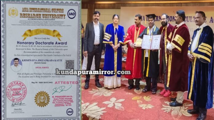 ಕುಂದಾಪುರ: ಸಮಾಜ ಸೇವಕ, ಹಲವಾರು ಸಂಘ ಸಂಸ್ಥೆಗಳನ್ನು ಮುನ್ನಡೆಸಿರುವ ಕುಂದಾಪುರ ತಾಲೂಕು ಅಂಕದಕಟ್ಟೆಯ ಕೃಷ್ಣಯ್ಯ ಜೋಗಿ ಅವರಿಗೆ ಏಷ್ಯಾ ಇಂಟರ್ನ್ಯಾಷನಲ್ ರಿಸರ್ಚ್ ಯುನಿವರ್ಸಿಟಿ (ಐಏಒ)ಗೌರವ ಡಾಕ್ಟರೇಟ್ ನೀಡಿ ಗೌರವಿಸಿದೆ. 26-10-2024 ರಂದು ತಮಿಳುನಾಡಿನ ಹೊಸೂರಿನಲ್ಲಿ ಪದವಿ ಪ್ರದಾನ ನೆರವೇರಿತು.