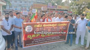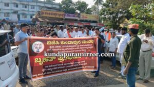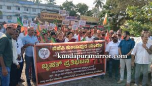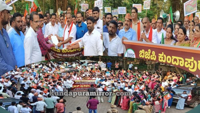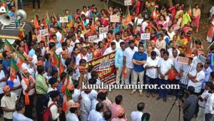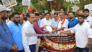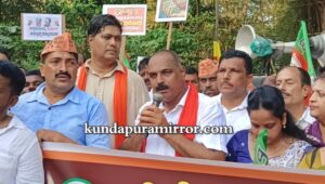 ಬಾರತೀಯ ಜನತಾ ಪಾರ್ಟಿ ಕುಂದಾಪುರ ಮಂಡಲ ಇದರ ನೇತೃತ್ವದಲ್ಲಿ ರೈತರ ಜಮೀನುಗಳನ್ನು ವಕ್ಫ್ ಬೋರ್ಡ್ ಹೆಸರಿಗೆ ನಮೂದಿಸಿದ ರಾಜ್ಯ ಸರಕಾರದ ಧೋರಣೆ ಖಂಡಿಸಿ ಕುಂದಾಪುರದಲ್ಲಿ ಮಂಗಳವಾರ ಸಂಜೆ ನಡೆದ ಬೃಹತ್ ಪ್ರತಿಭಟನೆಯಲ್ಲಿ ಅವರು ಮಾತನಾಡಿದರು.