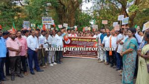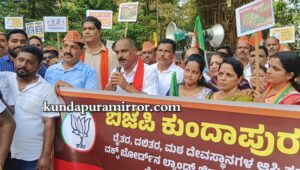 ಕುಂದಾಪುರ : ರಾಜ್ಯ ಸರಕಾರ ಒಂದೇ ಧರ್ಮದ ಪರವಾಗಿ ಕಾರ್ಯಾಚರಣೆ ಮಾಡುತ್ತಿದೆ. ರೈತರ ಭೂಮಿ, ಮಠ ಮಂದಿರದ ಭೂಮಿಗಳ ಪಹಣಿಯಲ್ಲಿ ವಕ್ಫ್ ಭೂಮಿ ಎಂದು ನೋಟಿಸ್ ಕೊಟ್ಟು ಕಾಂಗ್ರೆಸ್ ಸರಕಾರ ರೈತರನ್ನು ಅತಂತ್ರರನ್ನಾಗಿಸಿದೆ. ಎಂದು ಶಾಸಕ ಕಿರಣ್ ಕುಮಾರ್ ಕೊಡ್ಗಿ ಹೇಳಿದರು.
