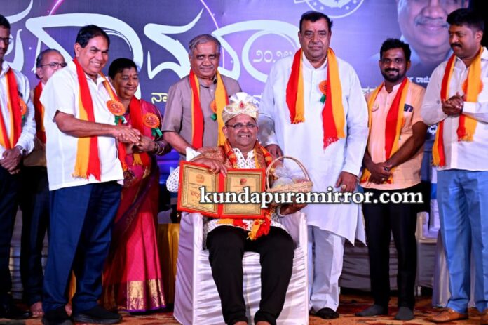 ಕುಂದಾಪುರ :ಕೋಟದ ಗಾಂಧಿ ಮೈದಾನದಲ್ಲಿ ಕೋಟ ಪಂಚವರ್ಣ ಯುವಕ ಮಂಡಲ ಅಧೀನಸಂಸ್ಥೆ ಪಂಚವರ್ಣ ಮಹಿಳಾ ಮಂಡಲದ ನೇತೃತ್ವದಲ್ಲಿ ಪ್ರತಿವರ್ಷ ನಡೆಸಲ್ಪಡುವ ಕನ್ನಡ ರಾಜ್ಯೋತ್ಸವ ಸದ್ಭಾವನಾ ೨೦೨೪ರ ನಾಡುನುಡಿಗೆ ಭಾವ ನಮನ ಕಾರ್ಯಕ್ರಮದಲ್ಲಿವಿಶೇಷ ಅಭಿನಂದನೆಯನ್ನು ಯಕ್ಷಕಲಾ ಅಕಾಡೆಮಿ ಬೆಂಗಳೂರು ಇದರ ಮುಖ್ಯಸ್ಥ ಕೃಷ್ಣಮೂರ್ತಿ ತುಂಗ ಸ್ವೀಕರಿಸಿದರು.