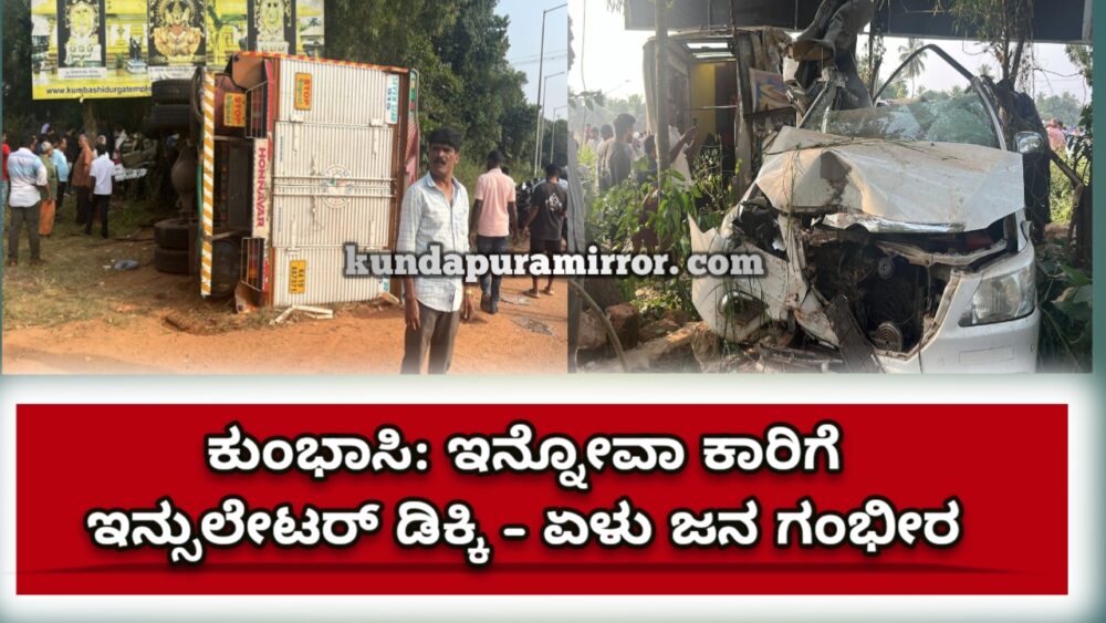ಕುಂದಾಪುರ: ರಿವರ್ಸ್ ಬರುತ್ತಿದ್ದ ಇನ್ನೋವಾ ಕಾರಿಗೆ ವೇಗವಾಗಿ ಬಂದ ಇನ್ಸುಲೇಟರ್ ಲಾರಿಯೊಂದು ಡಿಕ್ಕಿಹೊಡೆದ ಪರಿಣಾಮ ಇನ್ನೋವಾ ಕಾರಿನಲ್ಲಿದ್ದ ಏಳು ಜನರು ಗಂಭೀರ ಗಾಯಗೊಂಡು ಮಣಿಪಾಲ ಆಸ್ಪತ್ರೆಗೆ ದಾಖಲಾಗಿದ್ದು, ಇನ್ಸುಲೇಟರ್ ವಾಹನದಲ್ಲಿದ್ದ ಚಾಲಕನೂ ಗಾಯಗೊಂಡು ಆಸ್ಪತ್ರೆಗೆ ದಾಖಲಾಗಿರುವ ಘಟನೆ ರಾಷ್ಟ್ರೀಯ ಹೆದ್ದಾರಿ 66ರಲ್ಲಿ ಕುಂಭಾಸಿ ಸಮೀಪದ ಚಂಡಿಕಾ ದುರ್ಗಾಪರಮೇಶ್ವರಿ ದೇವಸ್ಥಾನದ ಎದುರುಗಡೆ ನಡೆದಿದೆ.