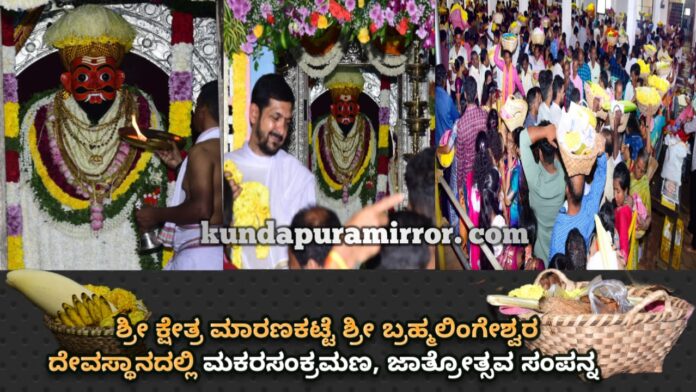 ಕುಂದಾಪುರ: ಅವಿಭಜಿತ ದಕ್ಷಿಣ ಕನ್ನಡ ಜಿಲ್ಲೆಯ ಪ್ರಮುಖ ಧಾರ್ಮಿಕ ಕ್ಷೇತ್ರಗಳಲ್ಲಿ ಒಂದಾಗಿರುವ, ಶ್ರೀ ಆದಿ ಶಂಕರಾಚಾರ್ಯರಿಂದ ಪ್ರತಿಷ್ಠಾಪಿಸಲ್ಪಟ್ಟ ಕ್ಷೇತ್ರ ಎನ್ನುವ ಪ್ರಸಿದ್ಧಿಯನ್ನು ಹೊಂದಿರುವ ಶ್ರೀ ಕ್ಷೇತ್ರ ಮಾರಣಕಟ್ಟೆಯ ಶ್ರೀ ಬ್ರಹ್ಮಲಿಂಗೇಶ್ವರ ದೇವಸ್ಥಾನದಲ್ಲಿ ಮಕರ ಸಂಕ್ರಮಣ ಉತ್ಸವ ಹಾಗೂ ವಾರ್ಷಿಕ ಗೆಂಡ ಸೇವೆ, ಜಾತ್ರಾ ಮಹೋತ್ಸವಕ್ಕೆ ನಾಡಿನ ವಿವಿಧ ಭಾಗಗಳಿಂದ ಸಹಸ್ರಾರು ಭಕ್ತರು ಆಗಮಿಸಿದರು.