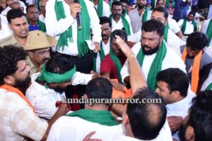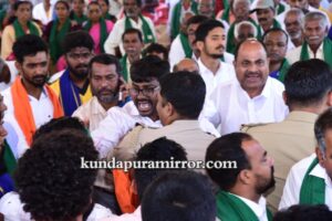 ಕುಂದಾಪುರ :ಬೈಂದೂರು ತಾಲೂಕು ಕಂಬದಕೋಣೆ ಗ್ರಾಮ ಪಂಚಾಯತ್ ವ್ಯಾಪ್ತಿಯ ಹೇರಂಜಾಲು ಏತನೀರಾವರಿ ಯೋಜನೆ ವೈಫಲ್ಯ, ಸ್ಥಳೀಯ ರೈತರಿಗೆ ಆಗುತ್ತಿರುವ ತೊಂದರೆ ಕುರಿತು ಹೇರಂಜಾಲು ಶ್ರೀ ದುರ್ಗಾ ಗಣೇಶೋತ್ಸವ ವೇದಿಕೆಯಲ್ಲಿ ನಡೆದ ಸಭೆಯಲ್ಲಿ ಎರಡು ತಂಡಗಳ ನಡುವೆ ತಳ್ಳಾಟ, ನೂಕಾಟ ನಡೆದು ಒಂದಿಷ್ಟ ಕಾಲ ಉದ್ವಿಗ್ನ ಪರಿಸ್ಥಿತಿ ನಿರ್ಮಾಣವಾಯಿತು. ಸಕಾಲದಲ್ಲಿ ಆರಕ್ಷಕ ಅಧಿಕಾರಿಗಳು ಪರಿಸ್ಥಿತಿಯನ್ನು ನಿಯಂತ್ರಿಸಿ ಸಭೆ ಮುಂದುವರಿಕೆಗೆ ಅವಕಾಶ ಮಾಡಿಕೊಟ್ಟರು.