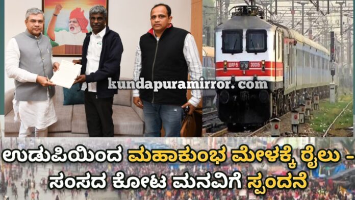 ದೇಶಾದ್ಯಂತ ಎಲ್ಲಾ ನಗರಗಳಿಂದಲೂ ವಿಶೇಷ ರೈಲುಗಳು ಓಡುತ್ತಿರುವ ಹಿನ್ನೆಲೆಯಲ್ಲಿ ಭಾರತೀಯ ರೈಲ್ವೆಯ ಕುಂಭ ಮೇಳ ಸೇವೆಗಳು ಉಡುಪಿ ಜಿಲ್ಲೆಯ ಅಸಂಖ್ಯಾತ ಭಕ್ತರಿಗೂ ಲಭಿಸ ಬೇಕು ಎನ್ನುವ ಕಾರಣದಿಂದ ಸಂಸದರು ವಿಶೇಷ ಪ್ರಯತ್ನ ನಡೆಸಿದ್ದು, ದೇಶಾದ್ಯಂತ ರೈಲು ಬೋಗಿಗಳ ಕೊರತೆಯ ಕಾರಣಗಳನ್ನು ಇಲಾಖೆ ನೀಡುತಿದ್ದರೂ ,ಸಾಮಾನ್ಯ ಜನರಿಗೂ ಕೈಗೆಟುಕಲಿ ಎಂಬ ದ್ರಷ್ಟಿಯಿಂದ, ಜನರಲ್ ಮತ್ತು ಎಸಿ ಕೋಚ್ ಇರುವ ರೈಲಿನ ವ್ವವಸ್ತೆಗೆ ಸಂಸದರು ಮನವಿ ಇಟ್ಟಿದ್ದು , ಈ ಬಗ್ಗೆ ಶೀಘ್ರ ಪ್ರಕಟಣೆ ಹೊರ ಬರುವ ನಿರೀಕ್ಷೆ ಇದೆ.