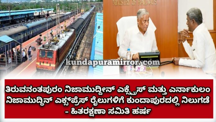 ಕುಂದಾಪುರ :ತಿರುವನಂತಪುರಂ ನಿಜಾಮುದ್ದೀನ್ ಎಕ್ಸ್ಪ್ರೆಸ್ ಮತ್ತು ಎರ್ನಾಕುಲಂ ನಿಜಾಮುದ್ಧಿನ್ ಎಕ್ಸ್ಪ್ರೆಸ್ ರೈಲುಗಳಿಗೆ ಕುಂದಾಪುರ ನಿಲುಗಡೆ ಬೇಕು ಎನ್ನುವ ಕುಂದಾಪುರ ರೈಲು ಪ್ರಯಾಣಿಕರ ಹಿತರಕ್ಷಣಾ ಸಮಿತಿಯ ವರ್ಷಗಳ ಬೇಡಿಕೆಯನ್ನು ಸಂಸದ ಕೋಟ ಶ್ರೀನಿವಾಸ್ ಪೂಜಾರಿಯವರು ಈಡೇರಿಸಿದ್ದು , ಎರಡೂ ರೈಲುಗಳಿಗೆ ಕುಂದಾಪುರ ನಿಲುಗಡೆ ನೀಡಿ ಸಚಿವರು ಆದೇಶ ನೀಡಿದ್ದು, ಕೊಲ್ಲೂರು ಮೂಕಾಂಬಿಕಾ ದೇಗುಲದ ಭಕ್ತಾದಿಗಳಿಗೆ, ದೆಹಲಿ,ಮುಂಬಯಿ, ವಾಪಿ, ಸಿಲ್ವಾಸ ತೆರಳುವ ಕುಂದಾಪುರದ ಪ್ರಯಾಣಿಕರಿಗೆ ಬಾರೀ ಅನೂಕುಲವಾಗಿದ್ದು ಸಂಸದರ ಈ ಸಾಧನೆಗೆ ಸಮಿತಿಯ ಅಧ್ಯಕ್ಷ ಗಣೇಶ್ ಪುತ್ರನ್ ಹರ್ಷ ವ್ಯಕ್ತ ಪಡಿಸಿದ್ದಾರೆ.