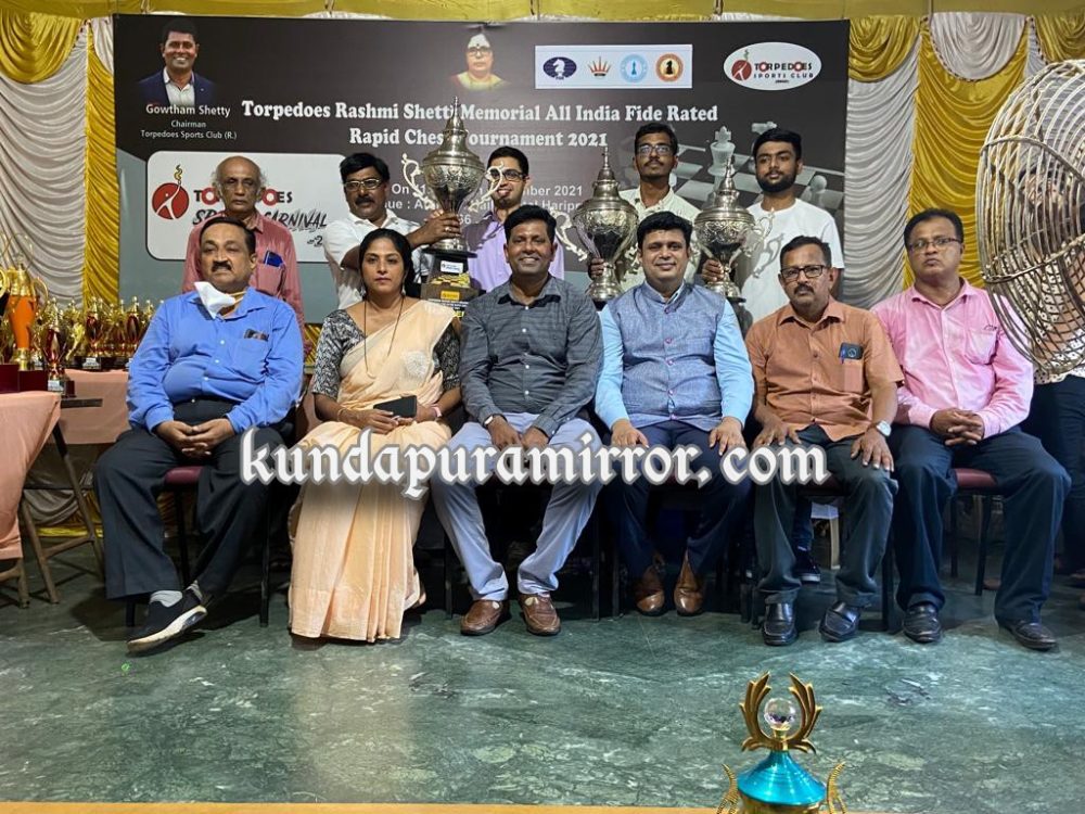 ಕುಂದಾಪುರ:ಟಾರ್ಪೆಡೊಸ್ ಸ್ಪೋರ್ಟ್ಸ್ ಕ್ಲಬ್ ಆಶ್ರಯದಲ್ಲಿ ನಡೆದ ಟಾರ್ಪೆಡೊಸ್ ರಶ್ಮೀ ಶೆಟ್ಟಿ ಸ್ಮಾರಕ ಅಖಿಲ ಭಾರತ ಫಿಡೆ ರೇಟಿಂಗ್ ಚೆಸ್ ಚಾಂಪಿಯನ್ಷಿಪ್ನಲ್ಲಿ ತಮಿಳುನಾಡಿನ ಐಎಂ ಮುತ್ತಯ್ಯ ಎಎಲ್ ಅವರು ಅಗ್ರ ಸ್ಥಾನದೊಂದಿಗೆ ಚಾಂಪಿಯನ್ ಪಟ್ಟ ಗೆದ್ದುಕೊಂಡರೆ, ಕರ್ನಾಟಕ ವಿವಿಧ ವಿಭಾಗಗಳಲ್ಲಿ ಮೇಲುಗೈ ಸಾಧಿಸಿ ಸಮಗ್ರ ಚಾಂಪಿಯನ್ ಪಟ್ಟ ತನ್ನದಾಗಿಸಿಕೊಂಡಿತು.