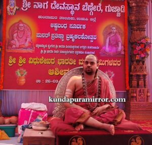 ಗುಜ್ಜಾಡಿ ಗ್ರಾಮದ ಬೆಣ್ಗೆರೆ ಶ್ರೀ ನಾಗ ದೇವಸ್ಥಾನದಲ್ಲಿ ಬುಧವಾರ ಶ್ರೀ ನಾಗದೇವರ ಜೀರ್ಣಾಷ್ಟಬಂಧ ಪುರ:ಸರ ಪುನರ್ ಪ್ರತಿಷ್ಠಾ ಮಹೋತ್ಸವ ಮತ್ತು ಬ್ರಹ್ಮಕಲಶೋತ್ಸವ ಕಾರ್ಯಕ್ರಮದಲ್ಲಿ ದೇವರಿಗೆ ಬ್ರಹ್ಮಕಲಶಾಭಿಷೇಕ ನೆರವೇರಿಸಿ, ಶ್ರೀ ನಾಗದೇವರಿಗೆ ಬೆಳ್ಳಿ ಪ್ರಭಾವಳಿ ಮತ್ತು ಪೀಠ ಸಮರ್ಪಣೆ ಮಾಡಿ ಆಶೀರ್ವಚನ ನೀಡಿ ಮಾತನಾಡಿದರು.
