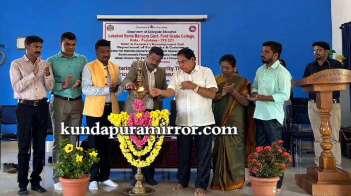 ಕುಂದಾಪುರ: ಇತ್ತೀಚಿನ ದಿನಗಳಲ್ಲಿ ಕೃಷಿ ಕ್ಷೇತ್ರವು ಡಿಜಿಟಲೀಕರಣಗೊಳ್ಳುತ್ತಿದೆ ಆದರೆ ಕೃಷಿ ಕ್ಷೇತ್ರದ ಬೆಳವಣಿಗೆಯ ದರ ಅಷ್ಟೊಂದು ತೃಪ್ತಿಕರವಾಗಿಲ್ಲ. ಆದ್ದರಿಂದ ಕೇಂದ್ರ ಮತ್ತು ರಾಜ್ಯ ಸರ್ಕಾರಗಳು ಕೃಷಿ ಕ್ಷೇತ್ರದಲ್ಲಿ ಉದ್ಯಮಶೀಲತೆಯನ್ನು ಬೆಳೆಸಲು ಕ್ರಮ ಕೈಗೊಳ್ಳುತ್ತಿವೆ. ಕೃಷಿ ಉದ್ಯಮದ ಮೂಲಕ ಸಮೃದ್ಧ ಗ್ರಾಮವನ್ನು ರೂಪಿಸಲು ಸರ್ಕಾರದ ಕೃಷಿ ಉದ್ಯಮ ಕಾರ್ಯಕ್ರಮ ನೆರವಾಗುತ್ತದೆ. ಈ ಅಂಶವನ್ನು ಗಮನದಲ್ಲಿರಿಸಿಕೊಂಡು ಇತ್ತೀಚಿಗೆ ಕೋಟದ ಲಕ್ಷ್ಮೀ ಸೋಮಬಂಗೇರ ಸರಕಾರಿ ಪ್ರಥಮದರ್ಜೆ ಕಾಲೇಜಿನಲ್ಲಿ ಐ.ಕ್ಯೂ.ಎ.ಸಿ, ಸಂಶೋಧನಾ ಘಟಕ, ಅಥಶಾಸ್ತ್ರ ಮತ್ತು ವಾಣಿಜ್ಯಶಾಸ್ತ್ರ ವಿಭಾಗಗಳೊಂದಿಗೆ ಸಿ.ಎಂ.ಡಿ.ಆರ್ , ಗೀತಾನಂದ ಫೌಂಡೇಶನ್ ಮಣೂರು ಮತ್ತು ಕಿನಾರ ಮೀನು ಕೃಷಿ ಉತ್ಪಾದಕರ ಕಂಪನಿಯ ಸಹಭಾಗಿತ್ವದಲ್ಲಿ ಒಂದು ದಿನದ ರಾಷ್ಟ್ರಮಟ್ಟದ ವಿಚಾರ ಸಂಕಿರಣವನ್ನು ಕೃಷಿ ಉದ್ಯಮಶೀಲತೆಯ ಮೂಲಕ ಗ್ರಾಮೀಣ ಸಮೃದ್ಧಿ ಉತ್ತೇಜಿಸುವುದು ಎಂಬ ಶೀರ್ಷಿಕೆಯ ಅಡಿಯಲ್ಲಿ ಕಾರ್ಯಕ್ರಮ ಹಮ್ಮಿಕೊಂಡಿತು.
