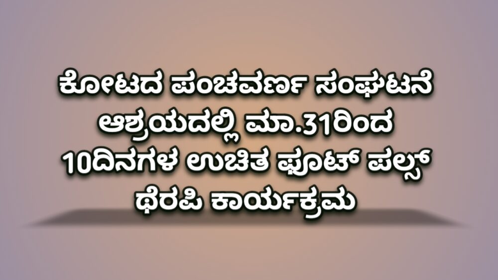 ಕೋಟ: ಪಂಚವರ್ಣ ಯುವಕ ಮಂಡಲ ಕೋಟ ಪ್ರವರ್ತಿತ ಸಂಸ್ಥೆ ಪಂಚವರ್ಣ ಮಹಿಳಾ ಮಂಡಲ ಕೋಟ, ಕೋಟ ಗ್ರಾಮ ಪಂಚಾಯತ್ ಇವರ ನೇತೃತ್ವದಲ್ಲಿ ಕಂಪಾನಿಯೋ ಇವರ ಸಹಯೋಗದೊಂದಿಗೆ ಮಾ.31ನೇ ಸೋಮವಾರದಿಂದ ಸುಮಾರು 10 ದಿನಗಳ ಕಾಲ ಸಮಯ ಬೆಳಿಗ್ಗೆ 9.30 ರಿಂದ ಸಂಜೆ 5.30ರ ತನಕ ಪ್ರತಿದಿನ ಅರ್ಧ ಗಂಟೆ ಉಚಿತ ಫೂಟ್ ಪಲ್ಸ್ ಥೆರಪಿ ಕಾರ್ಯಕ್ರಮ ಕೋಟದ ಪಂಚವರ್ಣ ಯುವಕ ಮಂಡಲದ ಕಛೇರಿಯಲ್ಲಿ ನಡೆಯಲಿದೆ