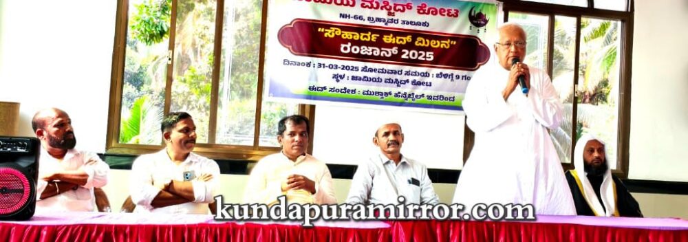 ಸೋಮವಾರ ಕೋಟ ಜಾಮಿಯ ಮಸ್ಜಿದ್ ಆಶ್ರಯದಲ್ಲಿ ರಂಜಾನ್ ಅಂಗವಾಗಿ ಸೌಹಾರ್ದ ಈದ್ ಮಿಲನ ರಂಜಾನ್ 2025 ಕಾರ್ಯಕ್ರಮದಲ್ಲಿ ಭಾಗವಹಿಸಿ ಮಾತನಾಡಿ ಧರ್ಮ ಧರ್ಮದ ನಡುವೆ ಸಂಬಂಧಗಳು ಗಟ್ಟಿಗೊಂಡು ಸಹಬಾಳ್ವೆ ಜೀವನ ನಡೆಸುವಂತ್ತಾಗಬೇಕು. ಮನಸ್ಸಿನ ಕಲ್ಮಶಗಳನ್ನು ಹೊರಹಾಗಿ ಹತೋಟಿಯಲ್ಲಿ ಉಪವಾಸವನ್ನು ಅರ್ಥಪೂರ್ಣಗೊಳಿಸುವ ಮುಸಲ್ಮಾನ ಬಂಧುಗಳ ಆಚರಣೆ ಬಹು ಮಹತ್ವಪಡೆದುಕೊಂಡಿದೆ. ತಮ್ಮ ಧರ್ಮ ಎಲ್ಲಾ ಧರ್ಮವನ್ನು ಪ್ರೀತಿಸುವ ಜತೆಗೆ ಅವರಿಗೆ ನೆರವು ನೀಡುವ ಕಾರ್ಯ ಭಗವಂತನಿಗೆ ಸಲ್ಲಿಸುವ ಕಾರ್ಯವಾಗಿದೆ ಎಂದರು.