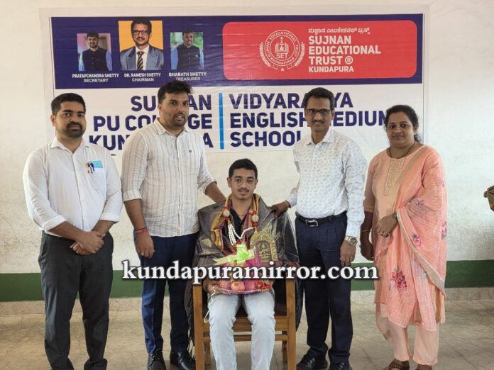 ಕುಂದಾಪುರ :ವಿದ್ಯಾರಣ್ಯ ಆಂಗ್ಲ ಮಾಧ್ಯಮ ಶಾಲೆಯ ವಿದ್ಯಾರ್ಥಿ ಆಯುಷ್ ಶೆಟ್ಟಿ ಎಸ್.ಎಸ್.ಎಲ್.ಸಿ. ವಾರ್ಷಿಕ ಪರೀಕ್ಷೆಯಲ್ಲಿ 625ಕ್ಕೆ 622 ಅಂಕಗಳಿಸಿ ರಾಜ್ಯಕ್ಕೆ ನಾಲ್ಕನೇ ರ್ಯಾಂಕ್ ಗಳಿಸಿದ್ದು ತನ್ನ ಉತ್ತಮ ಸಾಧನೆಯಿಂದ ಸಂತಸ ಗೊಂಡಿರುವ ವಿದ್ಯಾರ್ಥಿ ಮಾತನಾಡುತ್ತಾ “ತನ್ನ ಈ ಸಾಧನೆಗೆ ಶಾಲಾ ಶಿಕ್ಷಕರು, ಪೋಷಕರು ಮತ್ತು ಶಾಲಾ ಆಡಳಿತ ಮಂಡಳಿಯ ಸಹಕಾರವೇ ಕಾರಣ ಶಾಲೆಯಲ್ಲಿನ ಉತ್ತಮ ಬೋಧನೆ, ಪರೀಕ್ಷಾ ಸಮಯದಲ್ಲಿ ಶಾಲೆಯಲ್ಲಿ ಆಯೋಜಿಸಿದ ವಿಶೇಷ ಕಾರ್ಯಗಾರಗಳು, ಪೂರ್ವ ತಯಾರಿ ಪರೀಕ್ಷೆಗಳು, ಫಲಿತಾಂಶ ಆಧಾರಿತ ವಿಶೇಷ ಗಮನ ಸಹಪಠ್ಯ ಚಟುವಟಿಕೆಗಳು ತುಂಬಾ ಸಹಾಯವಾಗಿದ್ದು ಉತ್ತಮ ಸಾಧನೆಗೆ ಸಹಾಯವಾಯಿತು” ಎಂದನು. ಮುಂದೆ ವಿಜ್ಞಾನ ವಿಷಯವನ್ನು ಆಯ್ಕೆ ಮಾಡಿಕೊಂಡು ವೈದ್ಯನಾಗುವ ಕನಸನ್ನು ಹೊಂದಿದ್ದಾನೆ.
