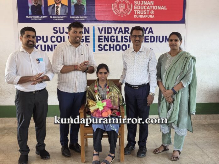ಕುಂದಾಪುರ :ವಿದ್ಯಾರಣ್ಯ ಆಂಗ್ಲ ಮಾಧ್ಯಮ ಶಾಲೆಯ ವಿದ್ಯಾರ್ಥಿನಿ ಅನುಶ್ರೀ ಎಸ್.ಎಸ್.ಎಲ್.ಸಿ. ವಾರ್ಷಿಕ ಪರೀಕ್ಷೆಯಲ್ಲಿ 625ಕ್ಕೆ 620 ಅಂಕಗಳಿಸಿ ರಾಜ್ಯಕ್ಕೆ 6ನೇ ರ್ಯಾಂಕ್ ಗಳಿಸಿದ್ದು ತನ್ನ ಉತ್ತಮ ಸಾಧನೆಯಿಂದ ಸಂತಸ ಗೊಂಡಿರುವ ವಿದ್ಯಾರ್ಥಿನಿ ಮಾತನಾಡುತ್ತಾ ತನ್ನ ಈ ಸಾಧನೆಗೆ ಶಾಲಾ ಶಿಕ್ಷಕರು, ಪೋಷಕರು ಮತ್ತು ಶಾಲಾ ಆಡಳಿತ ಮಂಡಳಿಯ ಸಹಕಾರವೇ ಕಾರಣ. ಶಾಲೆಯಲ್ಲಿನ ಉತ್ತಮ ಬೋಧನೆ, ಪರೀಕ್ಷಾ ಸಮಯದಲ್ಲಿ ಶಾಲೆಯಲ್ಲಿ ಆಯೋಜಿಸಿದ ವಿಶೇಷ ಕಾರ್ಯಗಾರಗಳು, ನಿರಂತರವಾಗಿ ಆಯೋಜಿಸಿದ ಪೂರ್ವ ತಯಾರಿ ಪರೀಕ್ಷೆಗಳು, ಸಾಮರ್ಥ್ಯ ಆಧಾರಿತ ಗುಂಪು ರಚನೆ ಮತ್ತು ಚಟುವಟಿಕೆಗಳು ತುಂಬಾ ಉಪಯೋಗವಾಗಿದ್ದು ಉತ್ತಮ ಸಾಧನೆಗೆ ಸಹಾಯವಾಯಿತು” ಎಂದಳು. ಮುಂದೆ ವಿಜ್ಞಾನ ವಿಷಯವನ್ನು ಆಯ್ಕೆ ಮಾಡಿಕೊಂಡು ವೈದ್ಯೆಯಾಗುವ ಕನಸನ್ನು ಹೊಂದಿದ್ದಾಳೆ.