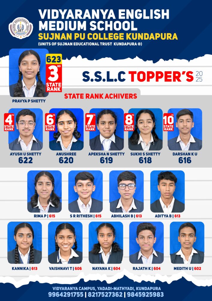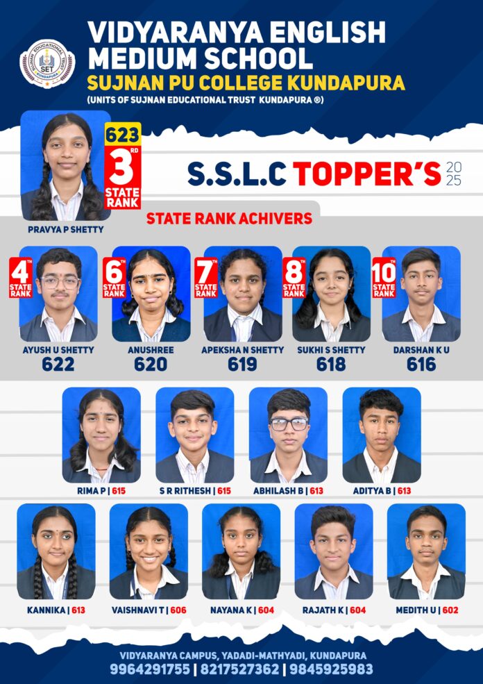 ಕುಂದಾಪುರ: ಕರ್ನಾಟಕ ಶಿಕ್ಷಣ ಇಲಾಖೆ ಪ್ರಕಟಿಸಿದ ಎಸ್.ಎಸ್.ಎಲ್.ಸಿ. ಪರೀಕ್ಷಾ ಫಲಿತಾಂಶ 2025 ರಲ್ಲಿ ಕುಂದಾಪುರದ ಯಡಾಡಿ-ಮತ್ಯಾಡಿಯ ಸುಜ್ಞಾನ್ ಎಜುಕೇಶನಲ್ ಟ್ರಸ್ಟ್ ನ ವಿದ್ಯಾರಣ್ಯ ಆಂಗ್ಲ ಮಾಧ್ಯಮ ಶಾಲೆಯ ವಿದ್ಯಾರ್ಥಿಗಳು ರಾಜ್ಯಮಟ್ಟದಲ್ಲಿ 10ರೊಳಗಿನ 6 ರ್ಯಾಂಕ್ಗಳನ್ನು ಪಡೆದು ಅಮೋಘ ಸಾಧನೆಗೈದಿದ್ದಾರೆ.