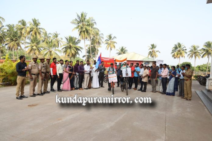 ಕಾಲೇಜಿನ ಆಡಳಿತ ಮಂಡಳಿಯ ಸದಸ್ಯರಾದ ನಾರಾಯಣ ನಾಯ್ಕ್ ಎನ್ಸಿಸಿ ಧ್ವಜ ಏರಿಸುವುದರ ಮೂಲಕ ಜಾಥಕ್ಕೆ ಚಾಲನೆ ನೀಡಿದರು. ನಾಗರಿಕ ಸಮಾಜವನ್ನು ಎಚ್ಚರಿಸುವ ಭಿತ್ತಿ ಪತ್ರಗಳನ್ನು ಹೊಂದಿರುವ, ವಿವಿಧ ಸಾಮಾಜಿಕ ಸಂದೇಶ ಸಾರುವ ಸೈಕಲ್ಗಳಲ್ಲಿ ವಿದ್ಯಾರ್ಥಿಗಳು ಕಾಲೇಜಿನಿಂದ ಮರವಂತೆ ಬೀಚ್ ತನಕ ಪಯಣಿಸಿದರು.