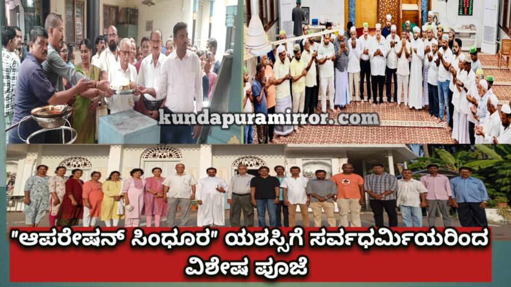 ಕುಂದಾಪುರ :“ಆಪರೇಷನ್ ಸಿಂಧೂರ” ಸೇನಾ ಕಾರ್ಯಾಚರಣೆಯ ಯಶಸ್ಸು ಮತ್ತು ಯೋಧರಿಗೆ ಒಳಿತನ್ನು ಕೋರಿ ಮುಜರಾಯಿ ಇಲಾಖೆ ಆದೇಶದ ಮೇರೆಗೆ ವಿಶೇಷ ಪೂಜೆಯನ್ನು ಕುಂದಾಪುರದ ಕುಂದೇಶ್ವರ ದೇವಸ್ಥಾನದಲ್ಲಿ ಪಂಚಾಮೃತ , ಮಂಗಳಾರತಿ ಮತ್ತು ಸಾಮೂಹಿಕ ಪ್ರಾರ್ಥನೆಯಿಂದ ನಡೆಸಲಾಯಿತು.