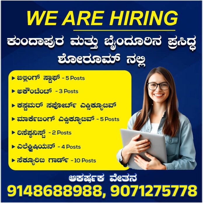 ಕುಂದಾಪುರ ಮತ್ತು ಬೈಂದೂರಿನ ವಿವಿಧ ಶೋರೂಮ್ ಗಳಲ್ಲಿ ವಿವಿಧ ಹುದ್ದೆಗಳಿಗೆ ಅಭ್ಯರ್ಥಿಗಳು ಬೇಕಾಗಿದ್ದಾರೆ.