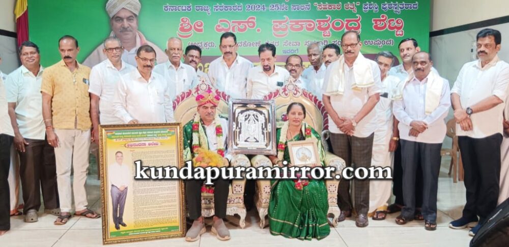 ಅವಿಭಜಿತ ಕುಂದಾಪುರ ತಾಲೂಕಿನ ಕೃಷಿಪತ್ತಿನ ಸಹಕಾರಿ ಸಂಘಗಳ ವತಿಯಿಂದ 2024-25ನೇ ಸಾಲಿನ ಕರ್ನಾಟಕ ಸರ್ಕಾರ ಕೊಡಮಾಡುವ ‘ಸಹಕಾರ ರತ್ನ’ ಪ್ರಶಸ್ತಿ ಪುರಸ್ಕøತ ಖಂಬದಕೋಣೆ ರೈತರ ಸೇವಾ ಸಹಕಾರ ಸಂಘದ ಅಧ್ಯಕ್ಷರಾದ ಎಸ್.ಪ್ರಕಾಶ್ಚಂದ್ರ ಶೆಟ್ಟಿ ಅವರಿಗೆ ಜು.20ರಂದು ಕುಂದಾಪುರದ ಬಂಟರ ಯಾನೆ ನಾಡವರ ಸಂಘದ ಆರ್.ಎನ್.ಶೆಟ್ಟಿ ಸಭಾಭವನದಲ್ಲಿ ಆಯೋಜಿಸಲಾದ ಅಭಿನಂದನಾ ಕಾರ್ಯಕ್ರಮದಲ್ಲಿ ಸನ್ಮಾನ ನೆರವೇರಿಸಿ ಮಾತನಾಡಿದರು.