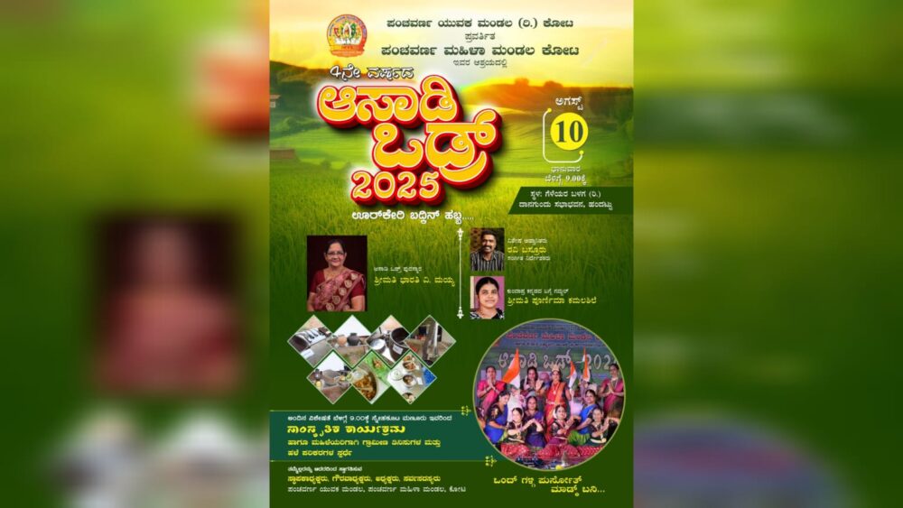 ಕೋಟ: ಕೋಟದ ಪಂಚವರ್ಣ ಮಹಿಳಾ ಮಂಡದ ನೇತೃತ್ವದಲ್ಲಿ ಮಾತೃಸಂಸ್ಥೆ ಪಂಚವರ್ಣ ಯುವಕ ಮಂಡಲ ಕೋಟ ಇದರ ಮಾರ್ಗದರ್ಶನದಲ್ಲಿ ಪ್ರತಿವರ್ಷ ಹಂದಟ್ಟು ಗೆಳೆಯರ ಬಳಗ ಸಭಾಂಗಣದಲ್ಲಿ ನಡೆಸಲ್ಪಡುವ ಆಸಾಡಿ ಒಡ್ರ್ -2025 ಕಾರ್ಯಕ್ರಮ ಆ.10 ರ ಪೂರ್ವಾಹ್ನ 9 ಗಂಟೆಗೆ ನಡೆಯಲಿದೆ. ಈ ಪ್ರಯುಕ್ತ ಕೋಟದ ಸಾಂಸ್ಕೃತಿಕ ಚಿಂತಕಿ ಭಾರತಿ ವಿ ಮಯ್ಯ ಇವರಿಗೆ ಆಸಾಡಿ ಒಡ್ರ್ ಸಾಧಕ ಪುರಸ್ಕಾರ ನೀಡಿ ಗೌರವಿಸಲಿದೆ.