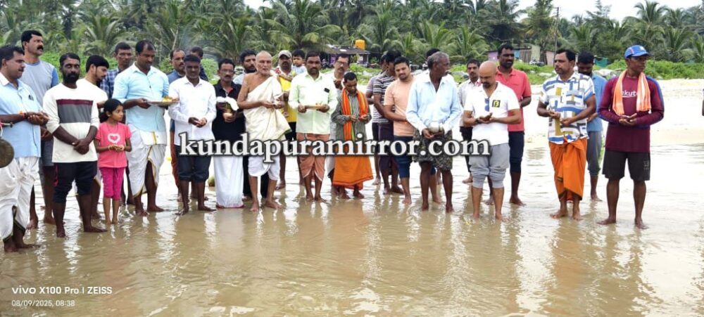 ಕೋಟ: ಸಾರ್ವಜನಿಕ ಗಣೇಶೋತ್ಸವ ಸಮಿತಿ ಕೋಡಿ ಕನ್ಯಾಣ ಇದರ ವತಿಯಿಂದ ಪ್ರತಿ ವರ್ಷ ನಡೆಯುವ ಸಮುದ್ರ ಪೂಜೆ ಶನಿವಾರ ನೆರವೆರಿತು. ಸಮುದ್ರ ಪೂಜಾ ವಿಧಿಗಳನ್ನು ವಿದ್ವಾನ್ ಸುಬ್ರಾಯ ಐತಾಳ್ ನೆರವೆರಿಸಿದರು.