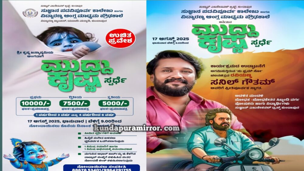 ಕುಂದಾಪುರ :ಸುಜ್ಞಾನ ಪದವಿ ಪೂರ್ವ ಕಾಲೇಜು ಹಾಗೂ ವಿದ್ಯಾರಣ್ಯ ಇಂಗ್ಲೀಷ್ ಮೀಡಿಯಂ ಸ್ಕೂಲ್ ಯಡಾಡಿ-ಮತ್ಯಾಡಿ. ಸುಜ್ಞಾನ್ ಎಜುಕೇಶನಲ್ ಟ್ರಸ್ಟ್ (ರಿ), ಕುಂದಾಪುರ. ಇವರ ಸಹಯೋಗದೊಂದಿಗೆ, ಶ್ರೀ ಕೃಷ್ಣ ಜನ್ಮಾಷ್ಟಮಿಯ ಅಂಗವಾಗಿ ಸಾರ್ವಜನಿಕರಿಗಾಗಿ ಮುದ್ದು ಕೃಷ್ಣ ಸ್ಪರ್ಧೆಯು ದಿನಾಂಕ: 17/08/2025, ಭಾನುವಾರದಂದು ಹಮ್ಮಿಕೊಳ್ಳಲಾಗಿದೆ.