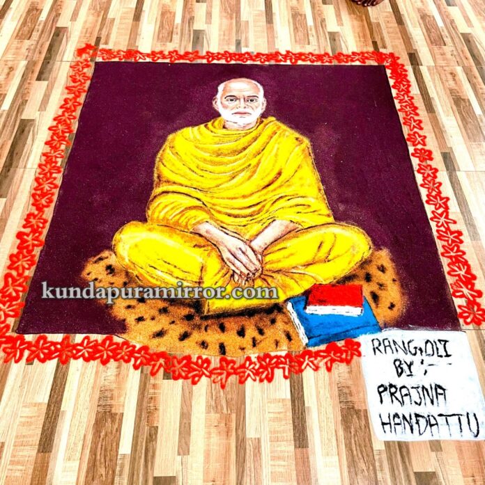 ಕುಂದಾಪುರ :ಸಾಸ್ತಾನದ ಗೋಳಿಗರಡಿ ಬ್ರಹ್ಮಬೈದರ್ಕಳ ದೈವಸ್ಥಾನದಲ್ಲಿ ಬ್ರಹ್ಮಶ್ರೀ ನಾರಾಯಣಗುರುಗಳ ಜಯಂತೋತ್ಸವ ಅಂಗವಾಗಿ ಯುವ ಕಲಾವಿದೆ ಪ್ರಜ್ಞಾ ಜಿ. ಹಂದಟ್ಟು ಇವರ ಕೈಯಂಗಳದಿ ಮೂಡಿಬಂದ ಬೃಹತ್ ಬ್ರಹ್ಮಶ್ರೀ ನಾರಾಯಣಗುರುಗಳ ರಂಗೋಲಿ ಚಿತ್ರ ವಿಶೇಷವಾಗಿ ಗಮನ ಸೆಳೆಯಿತು.