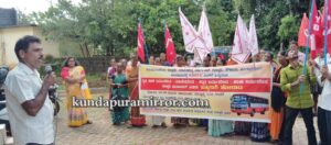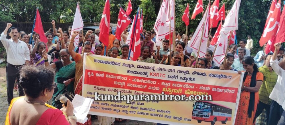 ಕುಂದಾಪುರ :ಕುಂದಾಪುರದಿಂದ ತಲ್ಲೂರು ಮಾವಿನಕಟ್ಟೆ ಮಾರ್ಗವಾಗಿ ಗುಲ್ವಾಡಿಗೆ ಅಲ್ಲಿಂದ ಸೌಕೂರು, ಕಂಡ್ಲೂರು ಮಾರ್ಗವಾಗಿ ಕುಂದಾಪುರಕ್ಕೆ ಕೆಎಸ್ಆರ್ಟಿಸಿ ಬಸ್ ಆರಂಭಿಸಲು ಒತ್ತಾಯಿಸಿ ಜನವಾದಿ ಮಹಿಳಾ ಸಂಘಟನೆ, ಪ್ರಾಂತ ಕೃಷಿ ಕೂಲಿಕಾರರ ಸಂಘ, ಹಂಚು ಕಾರ್ಮಿಕರು, ಕಟ್ಟಡ ಮತ್ತು ನಿರ್ಮಾಣ ಕಾರ್ಮಿಕರು ಗುಲ್ವಾಡಿ ಪಂಚಾಯತ್ ಎದುರು ಪ್ರತಿಭಟನೆ ನಡೆಸಿ, ಪಂಚಾಯತ್ ಪಿಡಿಓ ಮುಖಾಂತರ ಸಾರಿಗೆ ಆಯುಕ್ತರಿಗೆ ಮನವಿ ನೀಡಿದರು.
