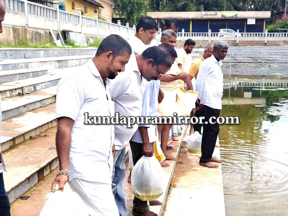 ಕುಂದಾಪುರ: ಇಲ್ಲಿನ ಅಭಿವೃದ್ಧಿಯ ಕೊನೆಯ ಹಂತದಲ್ಲಿರುವ ಕೋಟದ ಅಮೃತೇಶ್ವರೀ ದೇಗುಲದ ಸನಿಹದಲ್ಲಿರುವ ವರುಣತೀರ್ಥ ಕೆರೆಗೆ ಉಡುಪಿ ಮತ್ತು ಚಿಕ್ಕಮಗಳೂರು ಲೋಕಸಭಾ ಸದಸ್ಯ ಕೋಟ ಶ್ರೀನಿವಾಸ ಪೂಜಾರಿ ಕಾರ್ಕಳದ ಮೀನುಗಾರಿಗಾ ಉಪನಿರ್ದೇಶಕ ಕಛೇರಿ ನೀಡಿದ ಒಟ್ಟು ನಾಲ್ಕು ಸಾವಿರ ಅಧಿಕ ಮೀನುಗಳನ್ನು ಕೆರೆಗೆ ಸಮರ್ಪಿಸಿದರು.