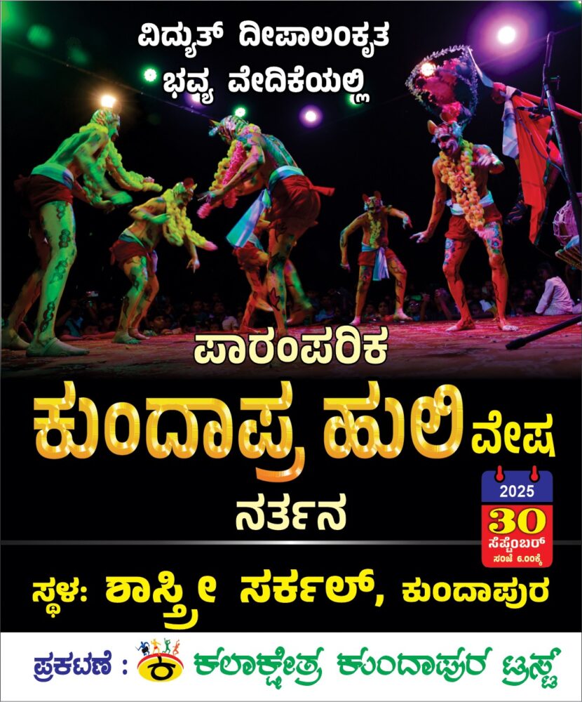 ಕುಂದಾಪುರ: ನಾಡಿನಾದ್ಯಂತ ಕುಂದಾಪ್ರ ಹುಲಿ ಎಂದೇ ಖ್ಯಾತಿ ಪಡೆದಿರುವ ನವರಾತ್ರಿ ಸಂದರ್ಭದಲ್ಲದಷ್ಟೆ ವೇಷ ತೊಟ್ಟು ನರ್ತಿಸುವ ಇಲ್ಲಿನ ಪಾರಂಪರಿಕ ಹುಲಿವೇಷದಾರಿಗಳ ನೃತ್ಯವು ಸೆಪ್ಟೆಂಬರ್ 30 ರಂದು ಸಂಜೆ 6.00ಕ್ಕೆ ಕುಂದಾಪುರ ಶಾಸ್ತ್ರಿ ವೃತ್ತದ ಸಮೀಪ ನಡೆಯಲಿದೆ.