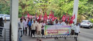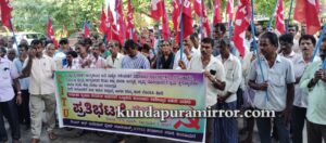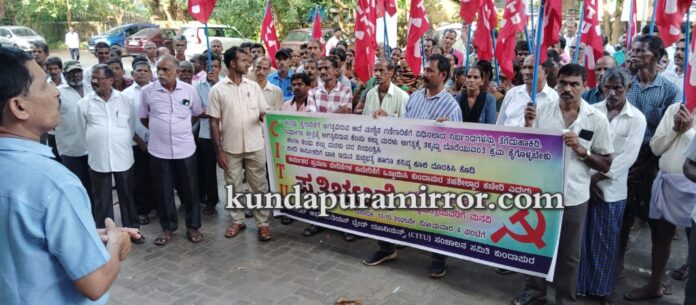 ಪ್ರತಿಭಟನೆಯನ್ನುದ್ದೇಶಿಸಿ ಮಾತನಾಡಿದ ಸಿಐಟಿಯು ಜಿಲ್ಲಾ ಪ್ರಧಾನ ಕಾರ್ಯದರ್ಶಿ ಚಂದ್ರಶೇಖರ್ ವಿ. ಹಂಚು ಮತ್ತು ಕಟ್ಟಡ ನಿರ್ಮಾಣ ಉದ್ಯೋಗ ನಂಬಿ ಬದುಕುತ್ತಿರುವ ಸಹಸ್ರಾರು ಕುಟುಂಬಗಳ ಅಳಿವು ಉಳಿವಿನ ಪ್ರಶ್ನೆ ಇದಾಗಿದೆ ಎಂದು ಅಭಿಪ್ರಾಯ ವ್ಯಕ್ತಪಡಿಸಿದರು. ಬ್ರಹ್ಮಾವರದಲ್ಲಿ ಸ್ಥಾಪಿಸಲು ಉದ್ದೇಶಿಸಿದ ಇಎಸ್ಐ ಆಸ್ಪತ್ರೆ ಶೀಘ್ರ ನಿರ್ಮಾಣ , ಬೀಡಿ ಕಾರ್ಮಿಕರಿಗೆ 2018 ರಿಂದಲೂ ಬಾಕಿ ಇರುವ ಕನಿಷ್ಠ ಕೂಲಿ ತುಟ್ಟಿಭತ್ಯೆ ಬಿಡುಗಡೆ ಗೊಳಿಸುವಂತೆ, ಪ್ರಾವಿಡೆಂಟ್ ಫಂಡ್ ಯೋಜನೆಗೆ ಸೇರ್ಪಡೆಗೊಳ್ಳುವ ಆದಾಯ ಮಿತಿ 36000 ಕ್ಕೆ ಹೆಚ್ಚಿಸಲು, ಸಾರಿಗೆ ಕಲ್ಯಾಣ ಮಂಡಳಿಗೆ ಅನುದಾನ ಬಿಡುಗಡೆಗೊಳಿಸಲು, ಕಟ್ಟಡ ಕಾರ್ಮಿಕರ 1996 ಕಾನೂನು ಉಳಿಸಿಕೊಳ್ಳುವಂತೆ, ಕಲ್ಯಾಣ ಮಂಡಳಿ ನಿಧಿ ದುರುಪಯೋಗ ತಡೆಗಟ್ಟುವಂತೆ, ಅಂಗನವಾಡಿ ಕೇಂದ್ರದಲ್ಲಿ F R S ಕೈಬಿಡುವಂತೆ ಒತ್ತಾಯಿಸಿದರು.