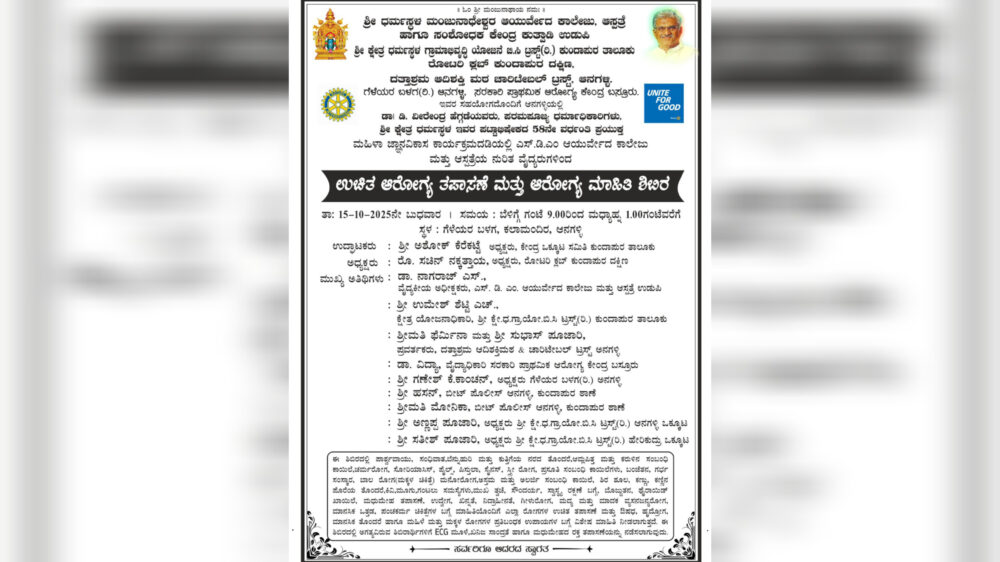 ಕುಂದಾಪುರ :ಶ್ರೀ ಧರ್ಮಸ್ಥಳ ಮಂಜುನಾಥೇಶ್ವರ ಆಯುರ್ವೇದ ಕಾಲೇಜು ಆಸ್ಪತ್ರೆ ಹಾಗೂ ಸಂಶೋಧಕ ಕೇಂದ್ರ ಕುತ್ಪಾಡಿ, ಉಡುಪಿ, ಶ್ರೀ ಕ್ಷೇ.ಧ.ಗ್ರಾ.ಯೋಜನೆ ಬಿ.ಸಿ ಟ್ರಸ್ಟ್ ಕುಂದಾಪುರ ತಾಲೂಕು, ರೋಟರಿ ಕ್ಲಬ್ ಕುಂದಾಪುರ ದಕ್ಷಿಣ, ದತ್ತಾಶ್ರಮ ಆದಿಶಕ್ತಿ ಮಠ ಚಾರಿಟೇಬಲ್ ಟ್ರಸ್ಟ್ ಆನಗಳ್ಳಿ, ಗೆಳೆಯರ ಬಳಗ ರಿ., ಆನಗಳ್ಳಿ, ಸರಕಾರಿ ಪ್ರಾಥಮಿಕ ಆರೋಗ್ಯ ಕೇಂದ್ರ ಬಸ್ರೂರು ಸಹಯೋಗದಲ್ಲಿ ಧರ್ಮಸ್ಥಳದ ಧರ್ಮಾಧಿಕಾರಿ ಡಾ.ಡಿ.ವೀರೇಂದ್ರ ಹೆಗ್ಗಡೆಯವರ ಪಟ್ಟಾಭೀಷೇಕದ 58ನೇ ವರ್ಧಂತಿ ಪ್ರಯುಕ್ತ ಮಹಿಳಾ ಜ್ಞಾನವಿಕಾಸ ಕಾರ್ಯಕ್ರಮದಡಿ, ಎಸ್.ಡಿ.ಎಂ ಆಯುರ್ವೇದ ಕಾಲೇಜು ಮತ್ತು ಆಸ್ಪತ್ರೆಯ ನುರಿತ ವೈದ್ಯರುಗಳಿಂದ ಅ.15 ಬುಧವಾರ, ಬೆಳಿಗ್ಗೆ 9 ಗಂಟೆಯಿಂದ ಮಧ್ಯಾಹ್ನ 1 ಗಂಟೆ ತನಕ ಆನಗಳ್ಳಿ ಗೆಳೆಯರ ಬಳಗದ ಕಲಾಮಂದಿರದಲ್ಲಿ ಆರೋಗ್ಯ ಉಚಿತ ತಪಾಸಣೆ; ಆರೋಗ್ಯ ಮಾಹಿತಿ ಶಿಬಿರ ನೆಡೆಯಲಿದೆ.