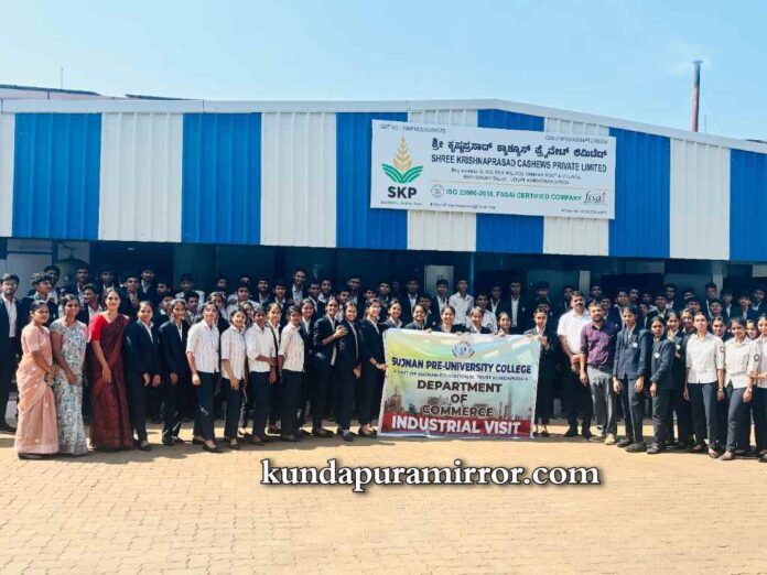 ಕುಂದಾಪುರ :ಸುಜ್ಞಾನ ಪದವಿಪೂರ್ವ ಕಾಲೇಜಿನ ವಾಣಿಜ್ಯ ವಿಭಾಗದ ವಿದ್ಯಾರ್ಥಿಗಳು ತಮ್ಮ ಶೈಕ್ಷಣಿಕ ಕಾರ್ಯಕ್ರಮದ ಭಾಗವಾಗಿ, ಡಿ. 16 ರಂದು ವಂಡಾರಿನ ‘ಕೃಷ್ಣ ಪ್ರಸಾದ್ ಕ್ಯಾಶ್ಯೂಸ್ ಪ್ರೈವೇಟ್ ಲಿಮಿಟೆಡ್’ ಕೈಗಾರಿಕಾ ಘಟಕಕ್ಕೆ ಭೇಟಿ ನೀಡಿದರು. ವಿದ್ಯಾರ್ಥಿಗಳಿಗೆ ಕೈಗಾರಿಕಾ ಕಾರ್ಯಾಚರಣೆಗಳ ಬಗ್ಗೆ ಪ್ರಾಯೋಗಿಕ ಜ್ಞಾನವನ್ನು ನೀಡುವ ಉದ್ದೇಶದಿಂದ ಈ ಭೇಟಿಯನ್ನು ಆಯೋಜಿಸಲಾಗಿತ್ತು.