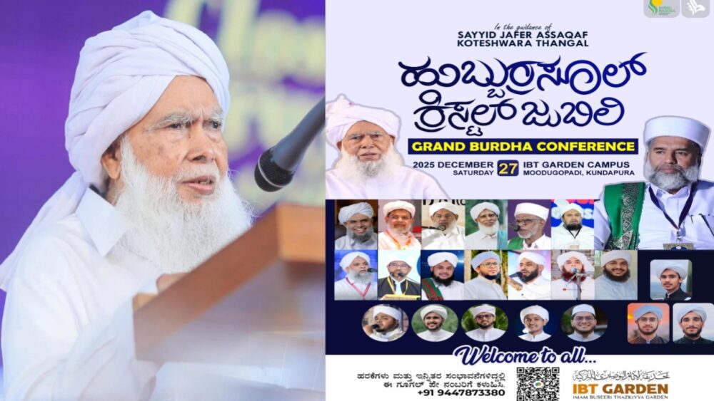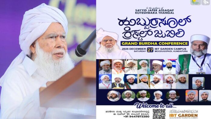 ಕುಂದಾಪುರ: ಸಯ್ಯಿದ್ ಕುಟುಂಬದ ಕಣ್ಮಣಿ ಅಸ್ಸಯ್ಯಿದ್ ಜಾಫರ್ ಅಸ್ಸಖಾಫ್ ಕೋಟೇಶ್ವರ ತಂಙಳ್ ರವರ ನೇತೃತ್ವದಲ್ಲಿ ನಡೆಯಲಿರುವ ಹುಬ್ಬುರ್ರಸೂಲ್ ಕ್ರಿಸ್ಟಲ್ ಜುಬಿಲಿ ಬೃಹತ್ ಬುರ್ದಾ ಕಾನ್ಫರೆನ್ಸ್ ಇದೇ ಬರುವ 2025 ಡಿಸೆಂಬರ್ 27 ಶನಿವಾರ ಸಂಜೆ 6:00ಕ್ಕೆ ಐಬಿಟಿ ಗಾರ್ಡನ್ ಮೂಡುಗೋಪಾಡಿ ಕುಂದಾಪುರದಲ್ಲಿ ನಡೆಯಲಿದೆ.