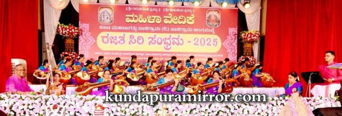 ಕುಂದಾಪುರ: ಕೂಟ ಮಹಾ ಜಗತ್ತು ಸಾಲಿಗ್ರಾಮ ಅಂಗ ಸಂಸ್ಥೆ ಇದರ ಮಹಿಳಾ ವೇದಿಕೆಯ ರಜತ ಸಿರಿ ಸಂಭ್ರಮ – 2025 ಇದರ ಕಾರ್ಯಕ್ರಮದ ಅಂಗವಾಗಿ ನಾದಲಹರಿ ಎನ್ನುವ 25 ವೀಣಾ ವಾದಕರ ಸಮೂಹ ವೀಣಾ ವಾದನದ ಸಾಲಿಗ್ರಾಮದ ಪರಿಸರದಲ್ಲಿ ಪ್ರಥಮ ಬಾರಿಗೆ ವಿಶೇಷ ಕಾರ್ಯಕ್ರಮ ನಡೆಯಿತು.