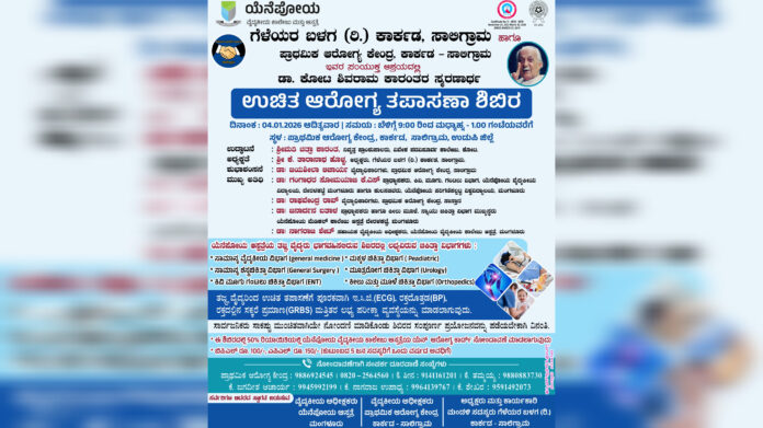 ಕುಂದಾಪುರ: ಯೆನೆಪೋ ವೈದ್ಯಕೀಯ ಕಾಲೇಜು ಮತ್ತು ಆಸ್ಪತ್ರೆ ಗೆಳೆಯರ ಬಳಗ ಕಾರ್ಕಡ, ಸಾಲಿಗ್ರಾಮ ಹಾಗೂ ಪ್ರಾಥಮಿಕ ಆರೋಗ್ಯ ಕೇಂದ್ರ, ಕಾರ್ಕಡ – ಸಾಲಿಗ್ರಾಮ ಇವರ ಸಂಯುಕ್ತ ಆಶ್ರಯದಲ್ಲಿ ಡಾ. ಕೋಟ ಶಿವರಾಮ ಕಾರಂತರ ಸ್ಮರಣಾರ್ಥ ಉಚಿತ ಆರೋಗ್ಯ ತಪಾಸಣಾ ಶಿಬಿರ ಜ. 04.ರ ಆದಿತ್ಯವಾರ ಬೆಳಿಗ್ಗೆ 9:00 ರಿಂದ ಮಧ್ಯಾಹ್ನ – 1.00 ಗಂಟೆಯವರೆಗೆ ಪ್ರಾಥಮಿಕ ಆರೋಗ್ಯ ಕೇಂದ್ರ, ಕಾರ್ಕಡ, ಸಾಲಿಗ್ರಾಮ ಇಲ್ಲಿ ಜರಗಲಿದೆ.