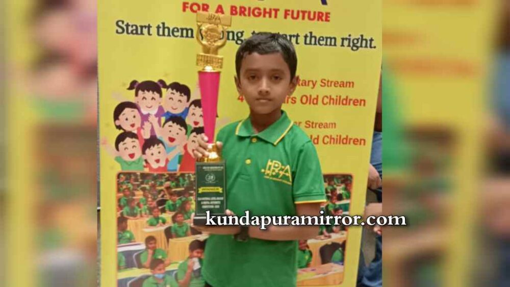 ಕುಂದಾಪುರ :ಐಡಿಯಲ್ ಪ್ಲೇ ಅಬಾಕಸ್ ಇಂಡಿಯಾ ಪ್ರೈ.ಲಿ. ಆಯೋಜಿಸಿದ್ದ 21ನೇ ರಾಷ್ಟ್ರ ಮಟ್ಟದ ಅಬಾಕಸ್ ಮತ್ತು ಮೆಂಟಲ್ ಅರಿತ್ಮೇಟಿಕ್ ಸ್ಪರ್ಧೆಯು ತಮಿಳುನಾಡಿನ ಪುದುಚೇರಿಯಲ್ಲಿ ದಿನಾಂಕ 25-01-2026 ರಂದು ನಡೆಯಿತು. ರಾಷ್ಟ್ರದ ವಿವಿಧ ರಾಜ್ಯಗಳಿಂದ 2200 ವಿದ್ಯಾರ್ಥಿಗಳು ಭಾಗವಹಿಸಿದ್ದರು. ಈ ಸ್ಪರ್ಧೆಯಲ್ಲಿ ಜಯಶ್ರೀ ಮತ್ತು ಸದಾನಂದ ಆಚಾರ್ಯ ತಲ್ಲೂರು ಇವರ ಪುತ್ರ ಜಯರಾಣಿ ಆಂಗ್ಲ ಮಾಧ್ಯಮ ಶಾಲೆ ತಲ್ಲೂರು ಇಲ್ಲಿನ 4 ನೇ ತರಗತಿ ವಿದ್ಯಾರ್ಥಿ ಸದ್ವಿನ್ ಎಸ್ ಆಚಾರ್ಯ ತಲ್ಲೂರು ಇವರು ZX ವಿಭಾಗದಲ್ಲಿ ಪ್ರಥಮ ಸ್ಥಾನ ಪಡೆದಿರುತ್ತಾರೆ. ಇವರಿಗೆ ಕುಂದಾಪುರ ಸೆಂಟರ್ ನ ಮಖ್ಯಸ್ಥ ಪ್ರಸನ್ನ ಕೆ. ಬಿ., ಬೋಧಕಿ ಮಹಾಲಕ್ಷ್ಮಿ ಮತ್ತು ದೀಪಾರವರು ತರಬೇತಿ ನೀಡಿರುತ್ತಾರೆ.